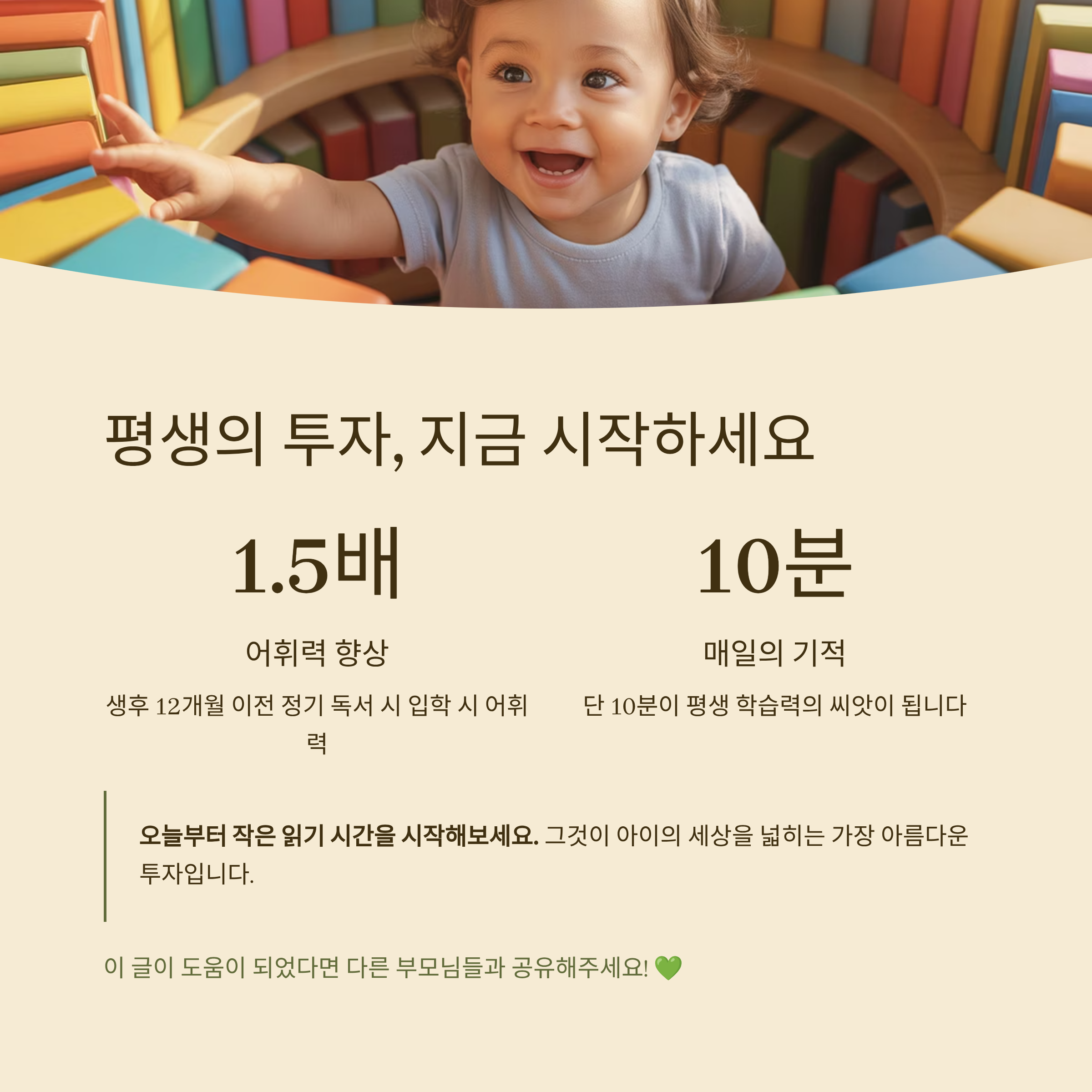 매일 단 10분이라도 아기에게 책을 읽어주세요. 그 짧고 따뜻한 순간들이 평생의 학습력, 창의력, 소통 능력을 키우는 씨앗이 됩니다.