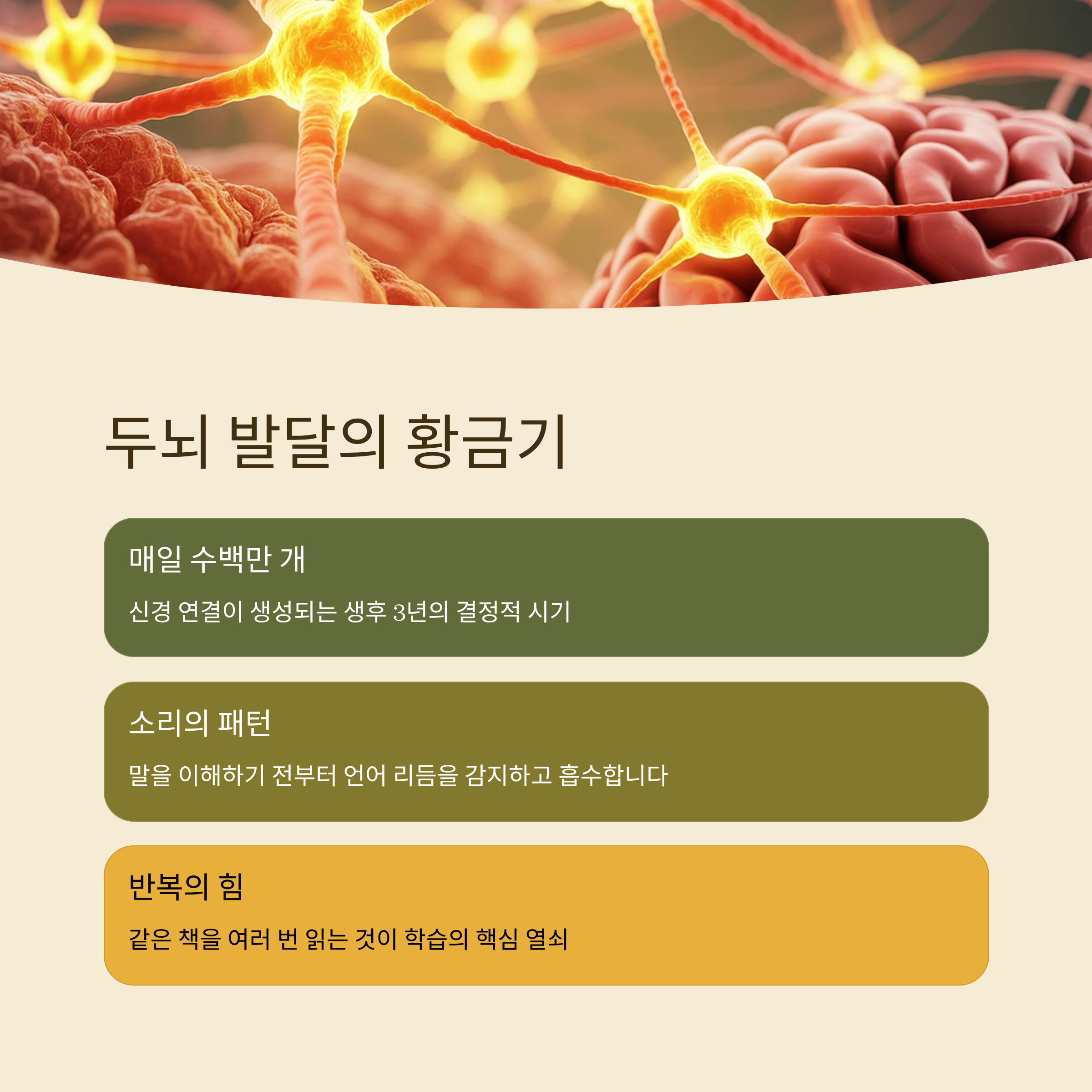 특히 반복은 핵심입니다. 같은 책을 여러 번 읽는 것이 어른에게는 지루할 수 있지만, 아기에게는 반복이 학습의 열쇠입니다. 반복적인 언어 노출은 불필요한 연결을 가지치기하고 중요한 연결을 강화해 이후 문해력 발달의 기초를 다집니다.