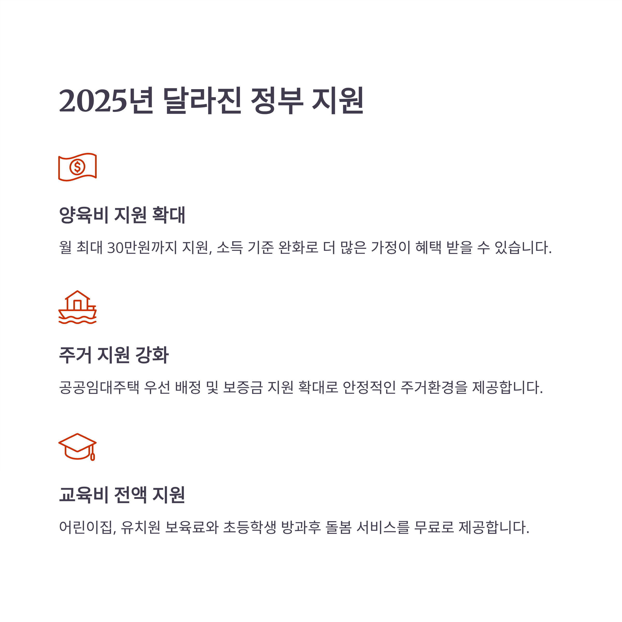 - 한부모가정 양육비 지원 확대: 월 최대 30만 원까지 지원, 소득 기준 완화.