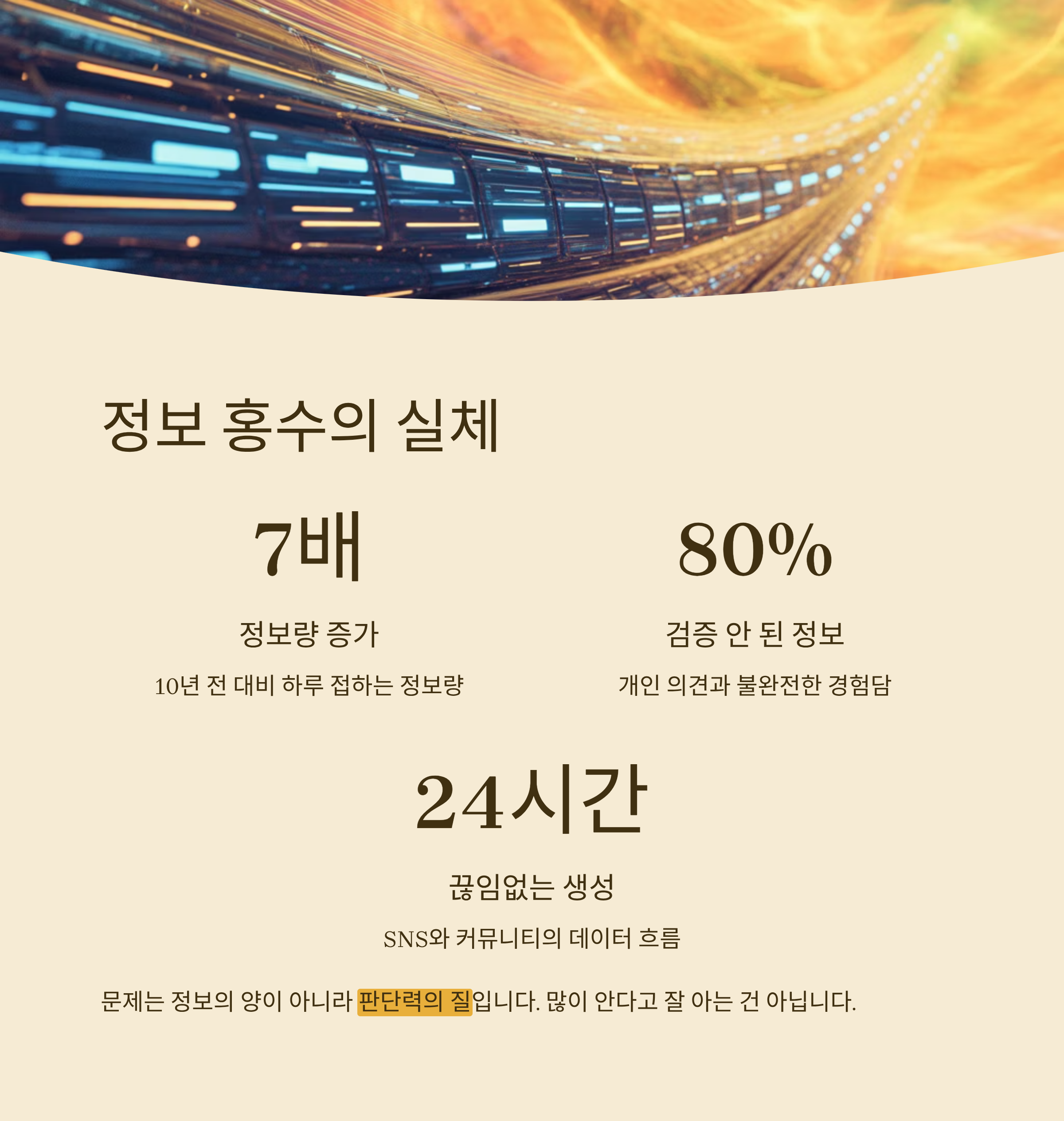 2025년 현재, 개인이 하루에 접하는 정보량은 10년 전보다 7배 이상 증가했습니다. 스마트폰, SNS, 온라인 커뮤니티는 24시간 내내 데이터를 생성하고 있으며, 그중 80% 이상은 개인 의견, 검증되지 않은 주장, 불완전한 경험담으로 구성되어 있습니다.