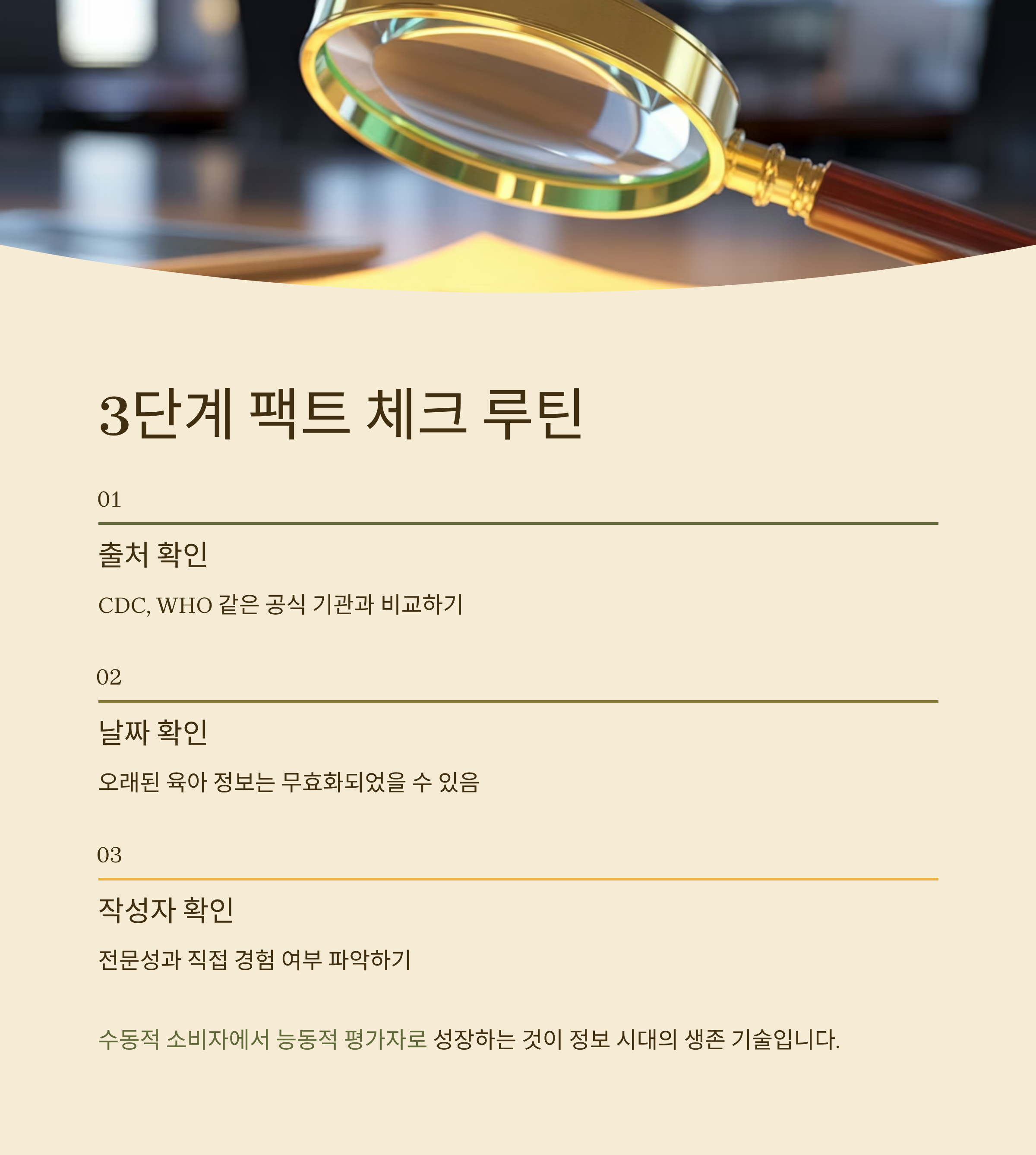 팩트 체크는 기자들만의 일이 아닙니다. 부모들도 일상에서 활용할 수 있는 3단계 검증 루틴을 만들 수 있습니다:
