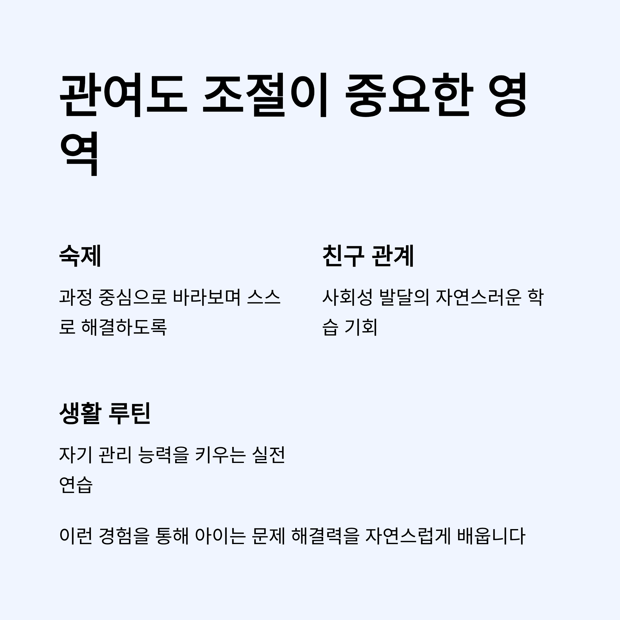 관여도 임계점은 부모가 개입을 줄여도 되는 적절한 시점입니다. 아이가 스스로 판단하고 선택할 수 있는 여유를 확보하는 지점이기도 합니다.