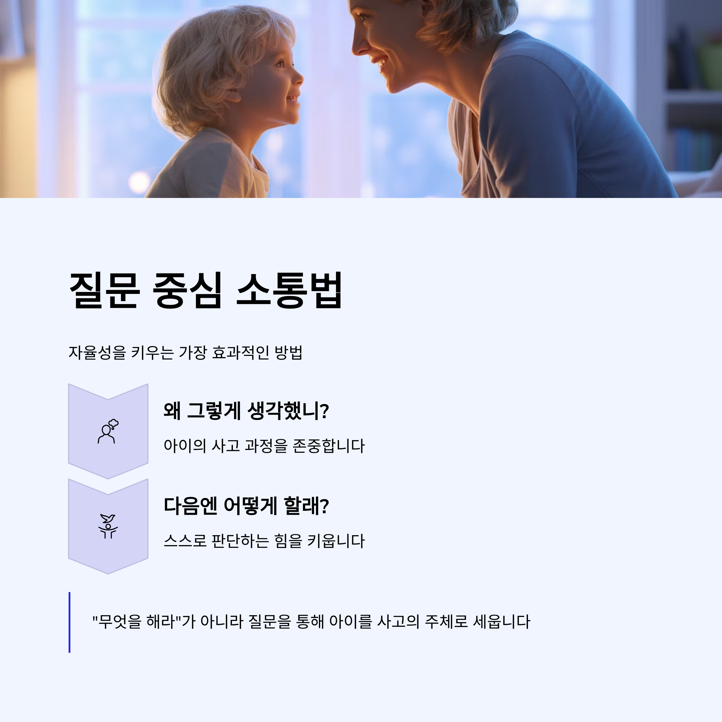 무엇을 해라가 아니라 왜 그렇게 생각했는지, 다음에는 어떤 선택을 하고 싶은지 묻는 방식은 아이를 사고의 주체로 세웁니다.