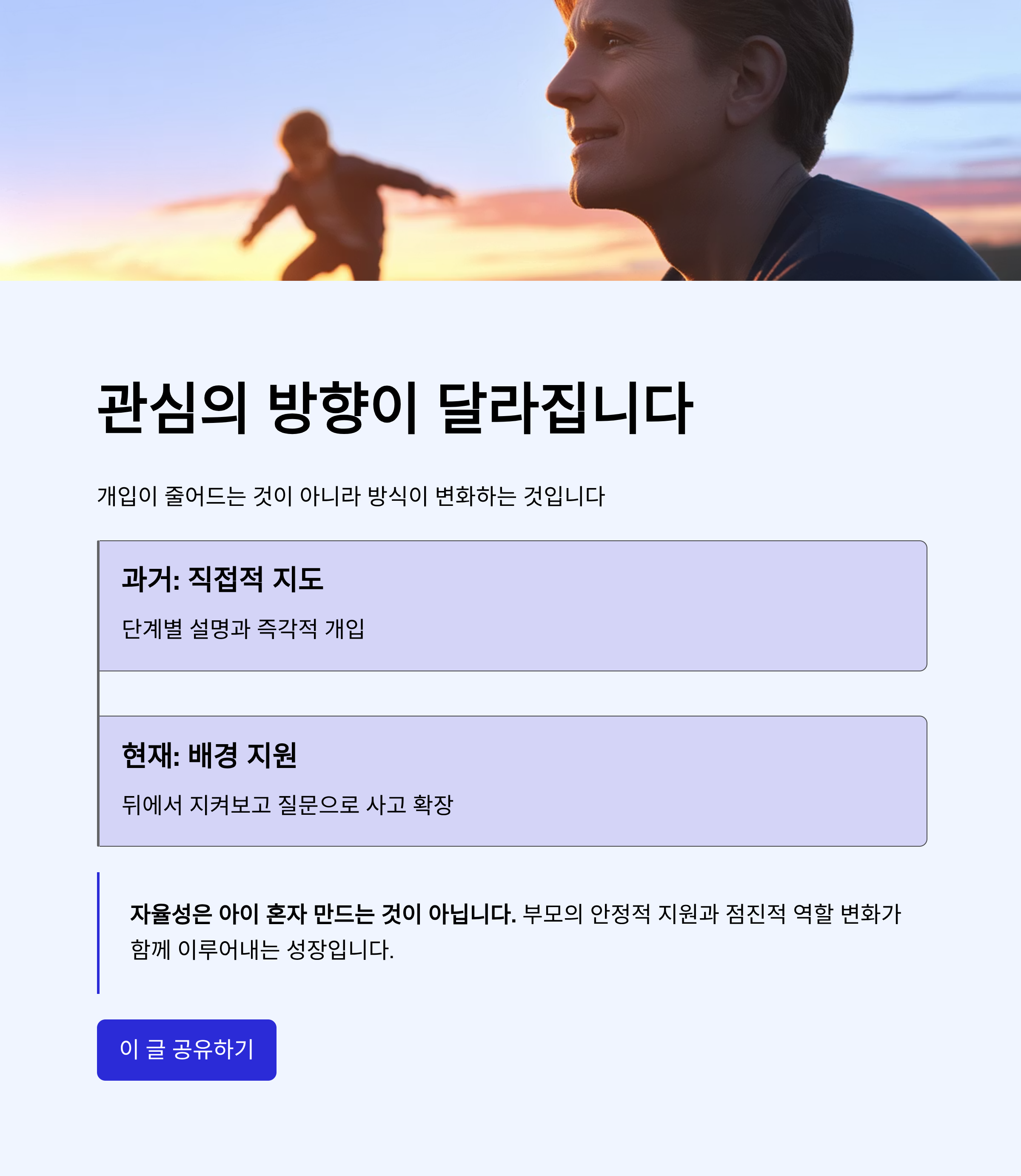 자율성이 커질수록 부모의 개입이 줄어드는 것처럼 보이지만, 실제로는 관심의 방향이 바뀌는 것입니다.