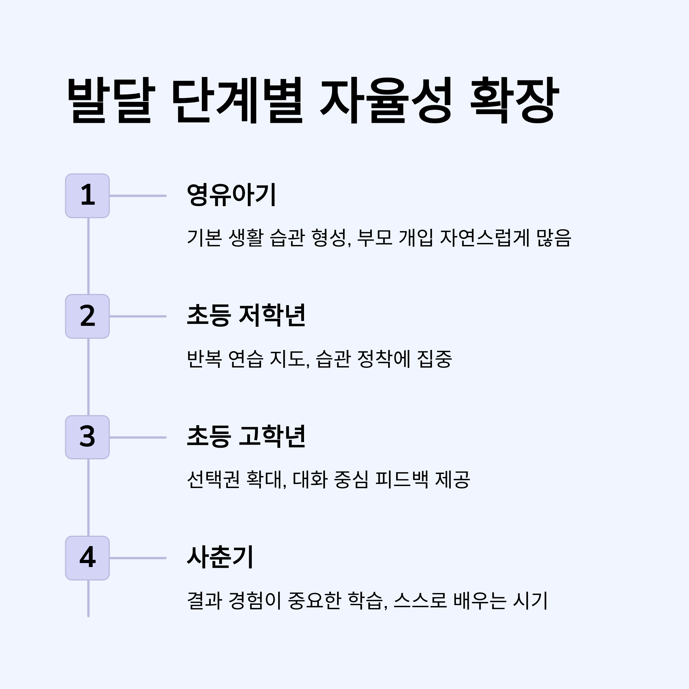 결국 자율성은 아이 혼자 만들어내는 성장이 아니라, 부모의 안정적인 배경 지원과 점진적인 역할 변화가 함께 이루어내는 결과입니다. 이 흐름을 꾸준히 유지하면 아이는 불안 대신 자신감을 경험하고, 부모는 통제가 아닌 신뢰 기반의 관계를 만들어 갈 수 있습니다.