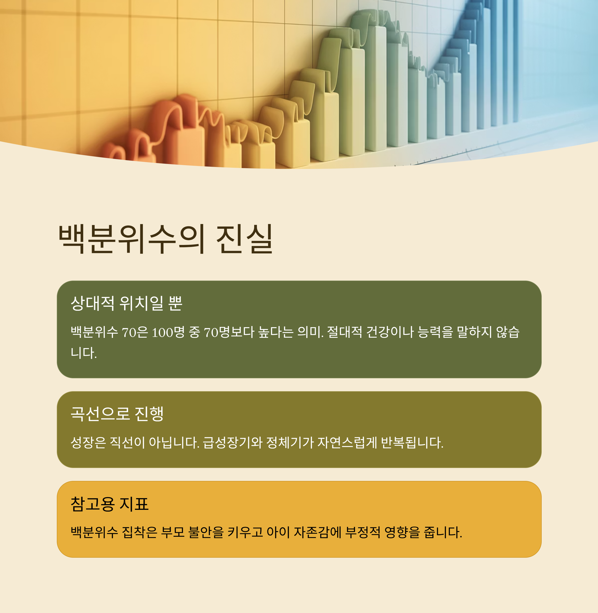 아이의 성장은 직선이 아니라 곡선 형태로 진행되며, 급성장기와 정체기가 번갈아 나타납니다. 백분위수의 변동은 자연스러운 과정이지, 아이가 늦거나 문제가 있다는 신호가 아닙니다.
