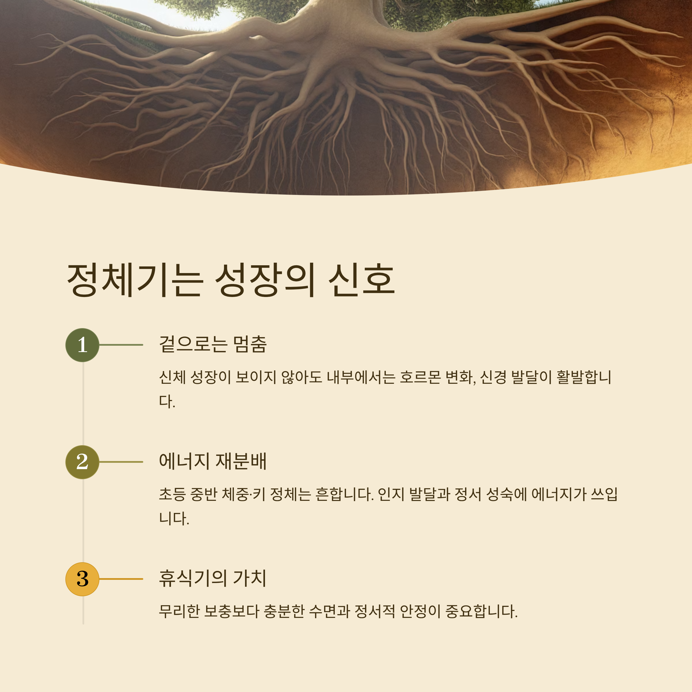 정체기는 ‘성장을 위한 휴식기’로 봐야 합니다. 무리한 보충학습이나 영양 과잉보다 충분한 수면과 정서적 안정이 훨씬 중요합니다.