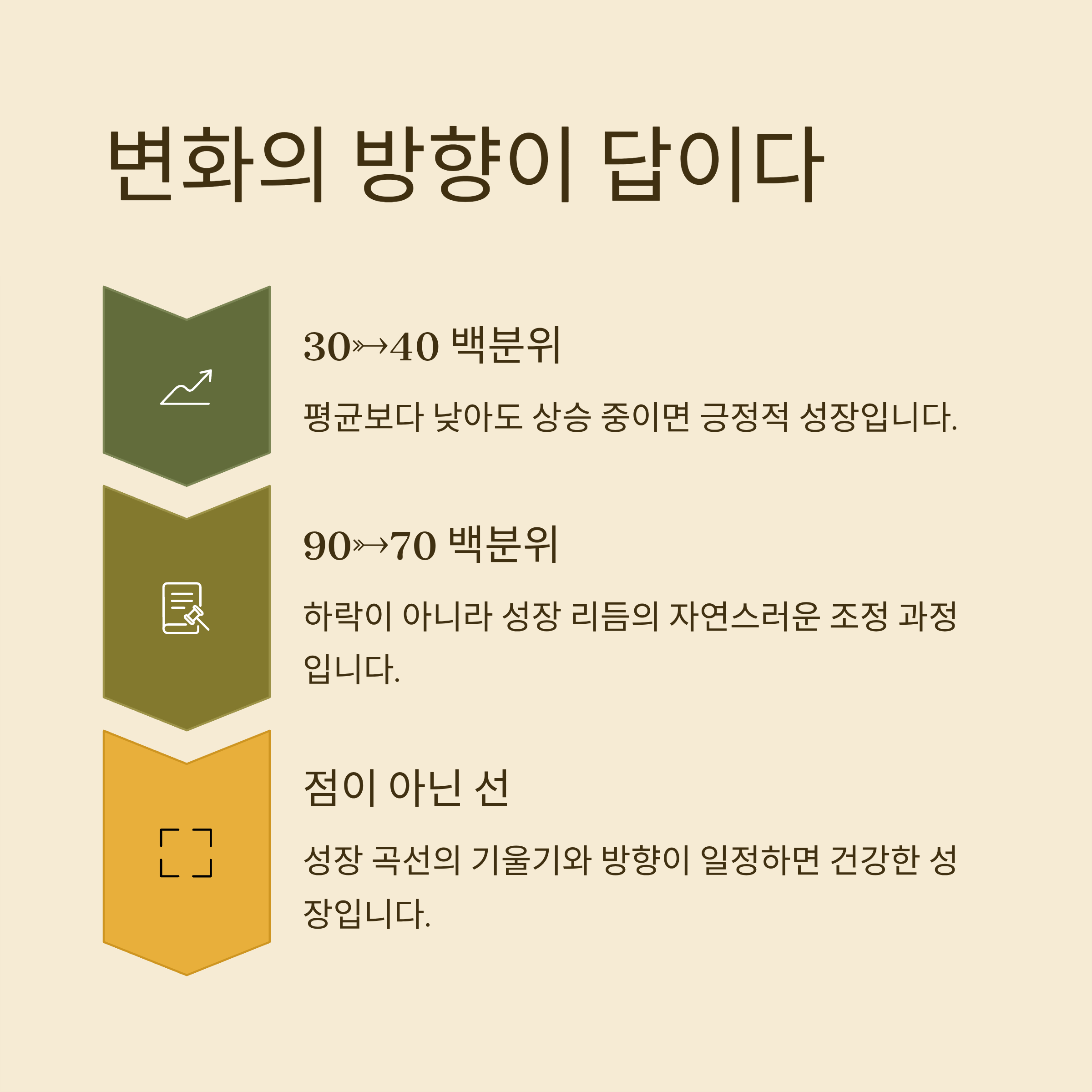 아이의 성장에서 가장 중요한 것은 수치 자체가 아니라 ‘변화의 흐름’입니다. 어떤 아이는 낮은 백분위수에서 천천히 상승하며 꾸준히 성장하고, 또 어떤 아이는 한동안 높은 수치를 유지하다가 일시적으로 정체를 겪기도 합니다.
