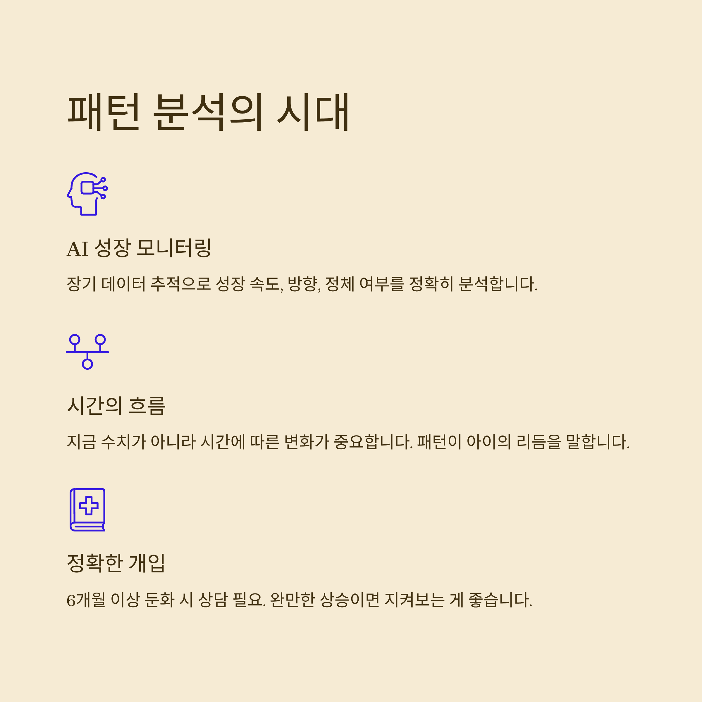 이런 접근은 부모가 불안에 흔들리지 않고, 정확한 개입 시점을 파악하는 데 도움을 줍니다. 예를 들어 6개월 이상 성장 속도가 계속 둔화된다면 전문가의 상담이 필요하지만, 완만한 상승 추세라면 그대로 지켜보는 것이 더 좋습니다.