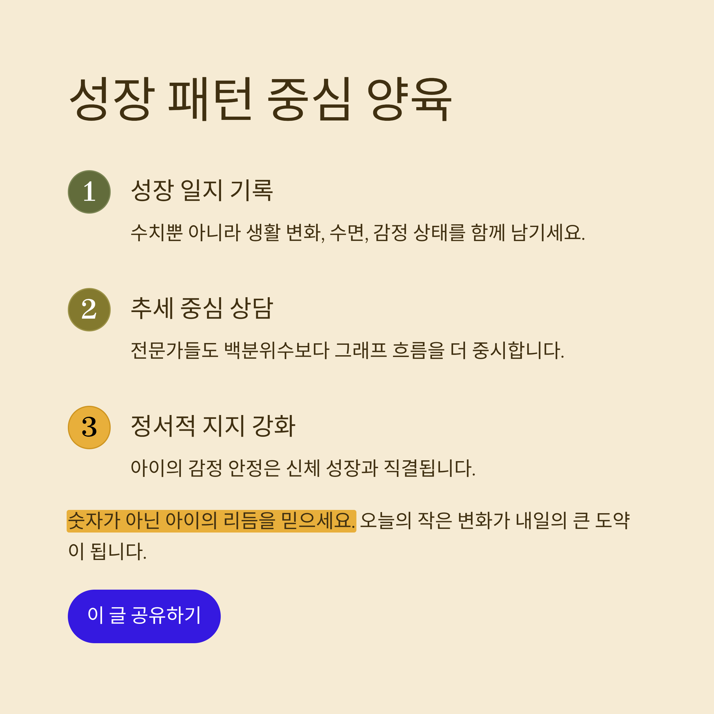 결국 중요한 것은 ‘지금 수치가 몇인지’가 아니라 ‘시간에 따라 어떻게 변화하는가’입니다. 성장 패턴을 읽는 것은 아이의 내면 리듬을 이해하는 과정입니다.