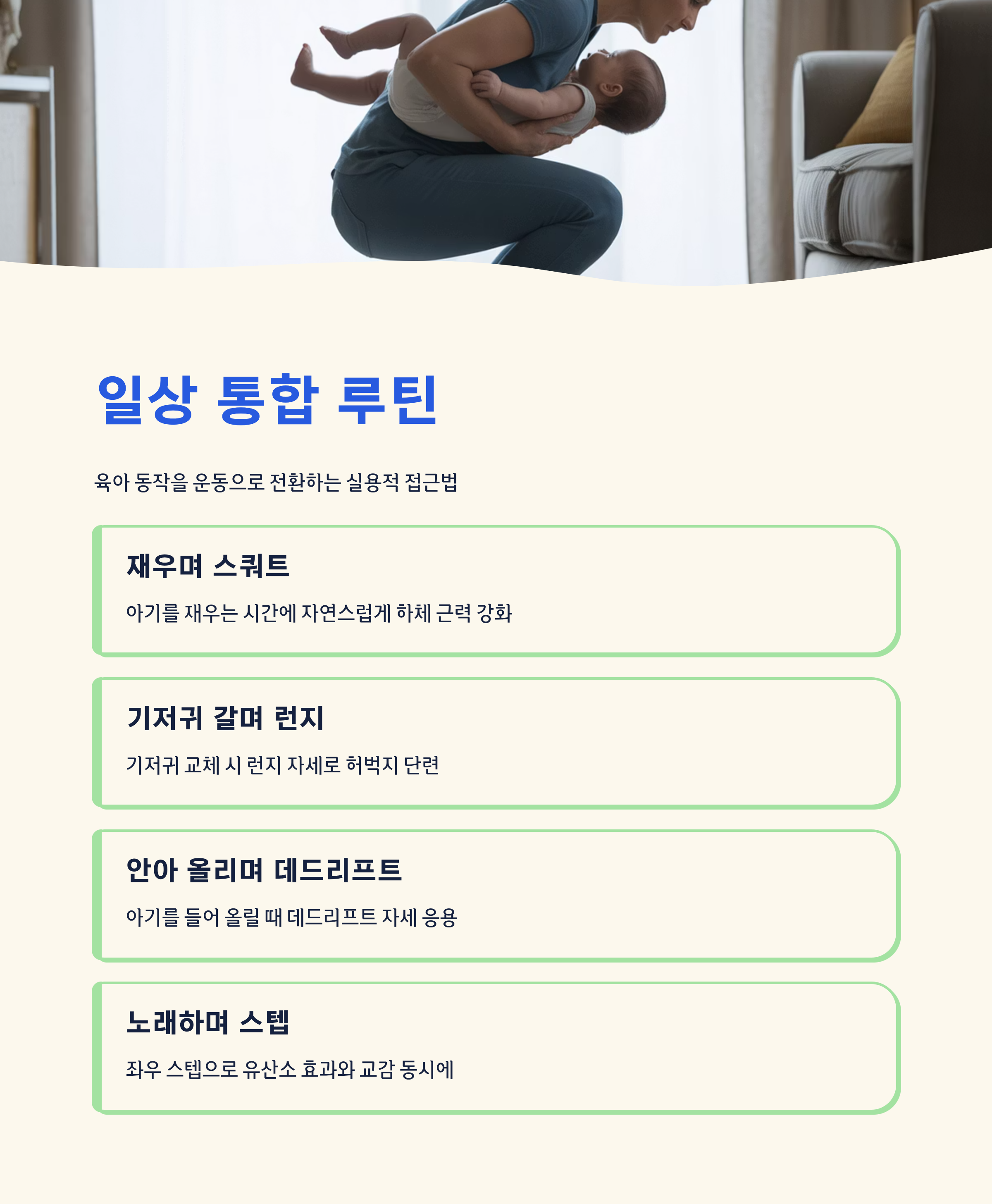예를 들어, 아기를 재우며 스쿼트를 하거나, 기저귀를 갈 때 런지 자세를 취하거나, 안아 올릴 때 데드리프트 자세를 응용할 수 있다.
