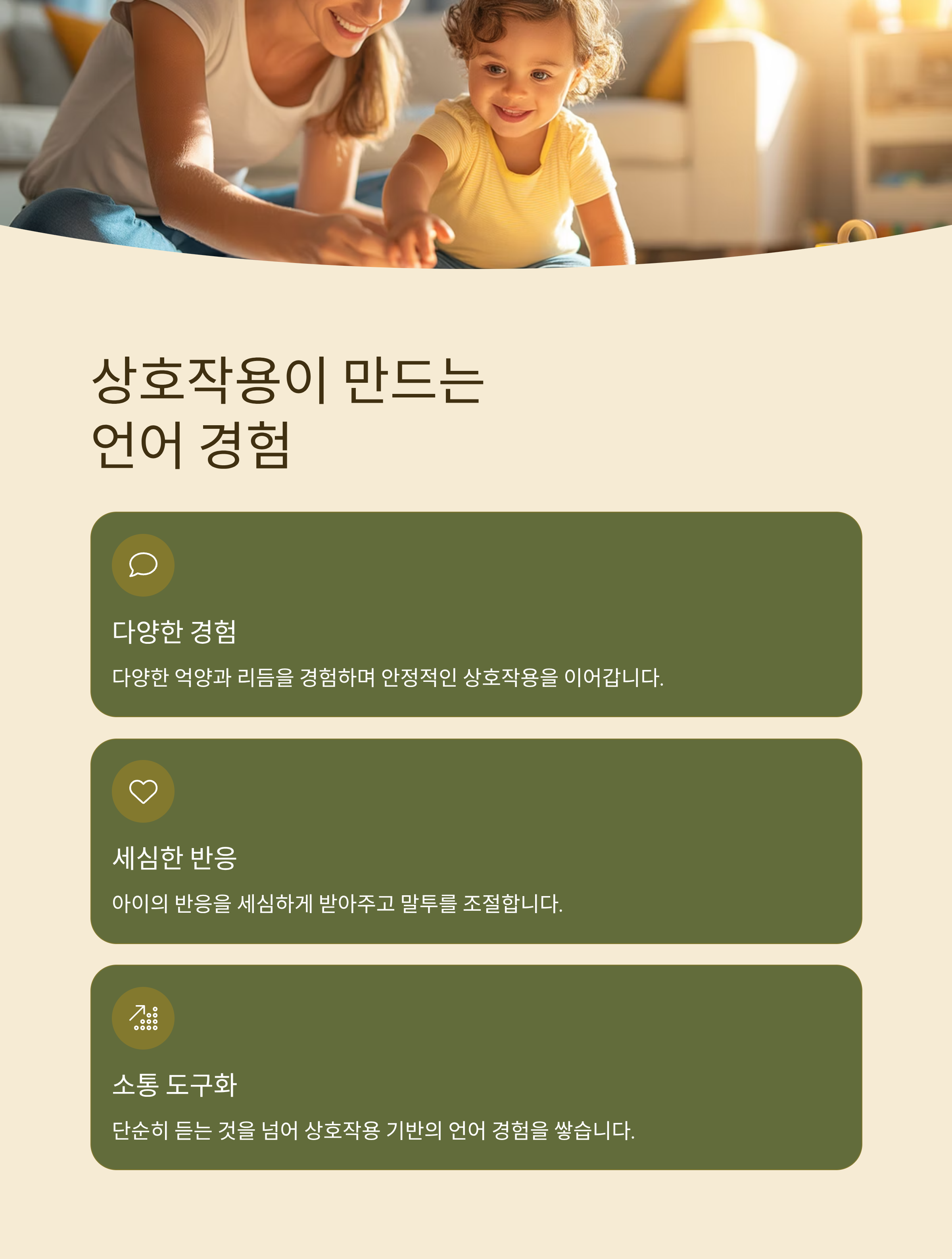 언어 임계기 동안 가장 중요한 점은 아이가 다양한 억양과 리듬을 경험하며 안정적인 상호작용을 이어가는 것입니다. 부모가 아이의 반응을 세심하게 받아주고 말투를 조절하면, 아이는 단순히 듣는 것을 넘어 상호작용 기반의 언어 경험을 쌓습니다.