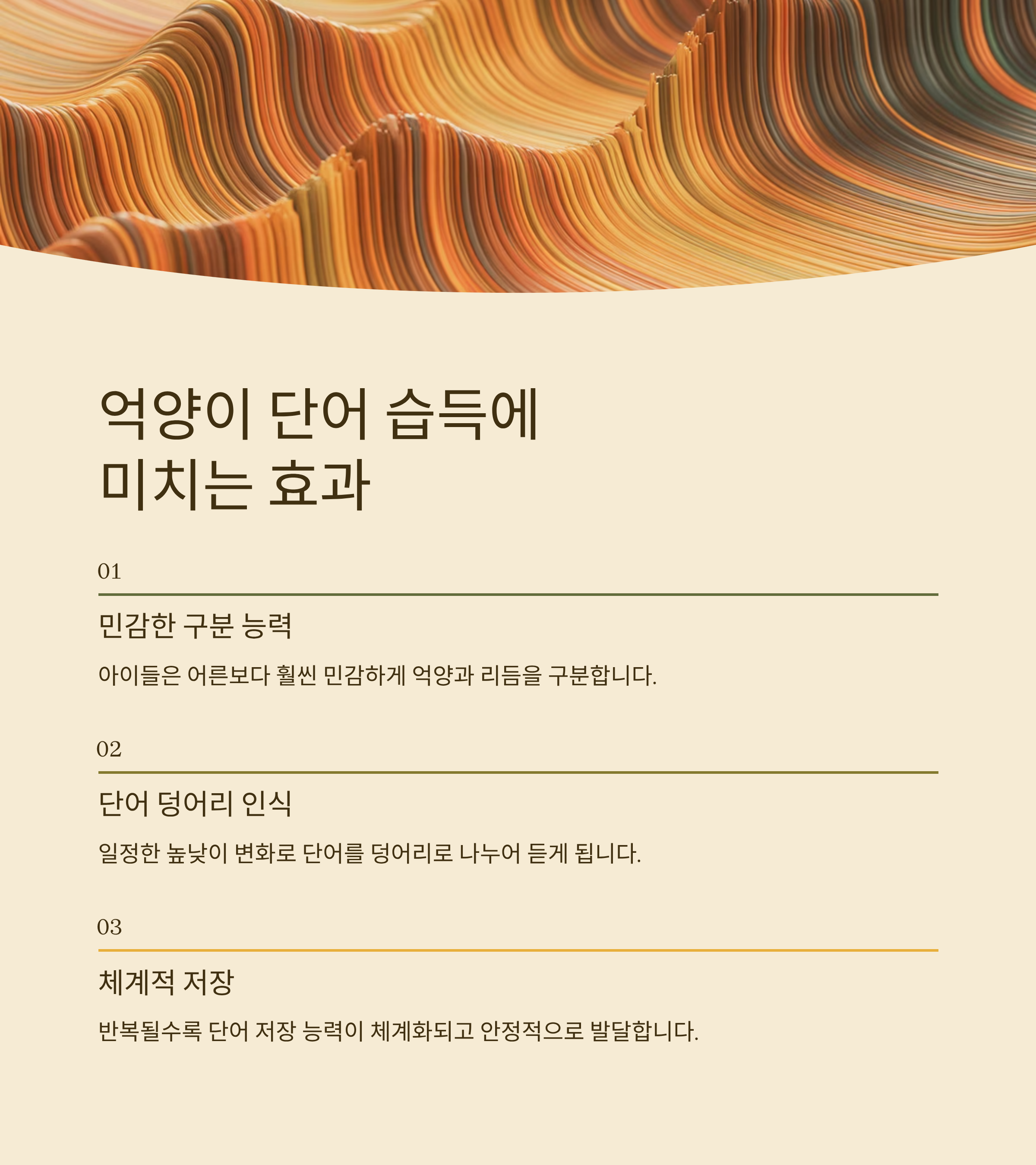 아이들은 어른보다 훨씬 민감하게 억양과 리듬을 구분합니다. 일정한 높낮이 변화는 아이가 단어를 덩어리로 나누어 듣게 하여 새로운 어휘를 안정적으로 받아들이도록 돕습니다.