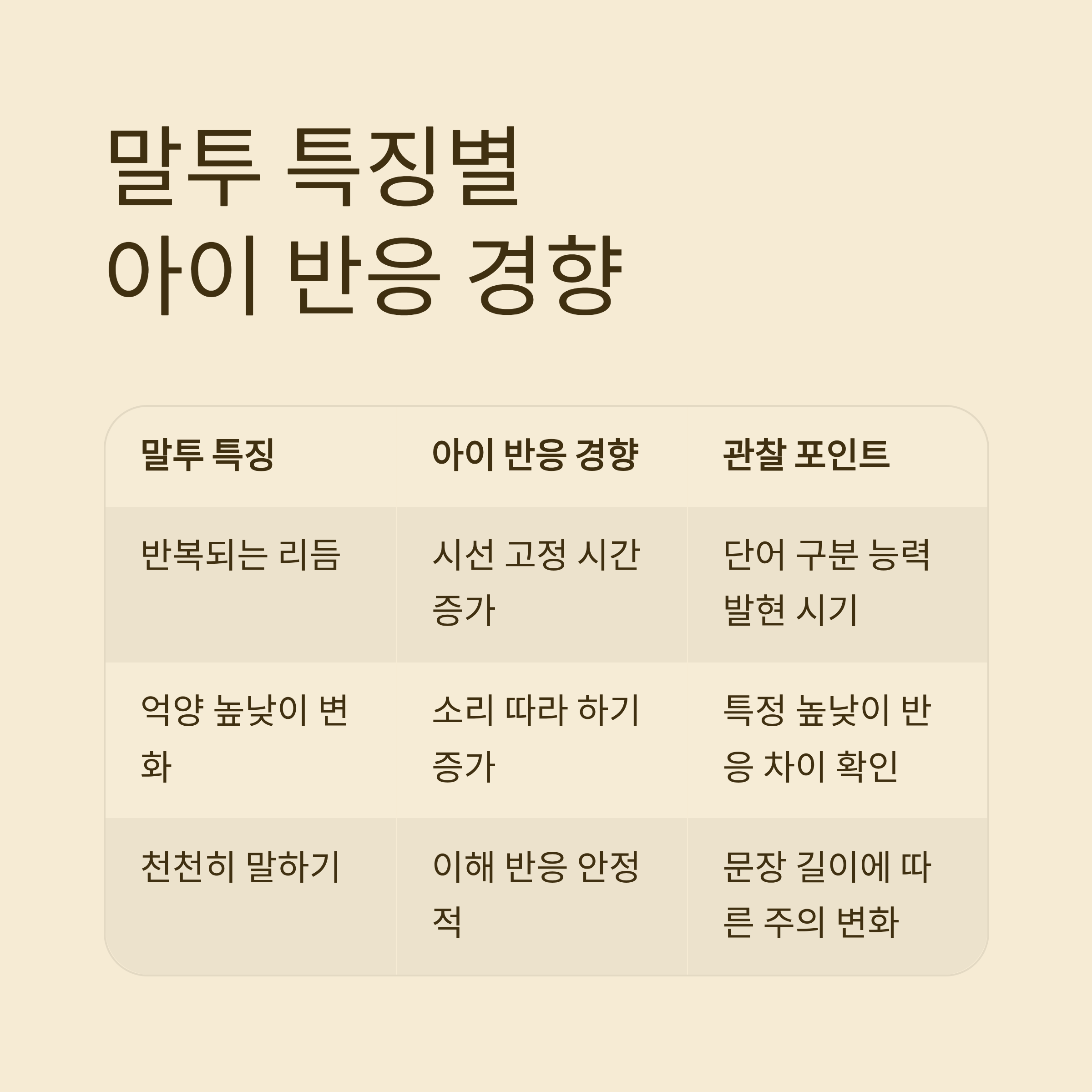 | 억양 높낮이 변화 | 소리 따라 하기 증가 | 특정 높낮이 반응 차이 확인 |