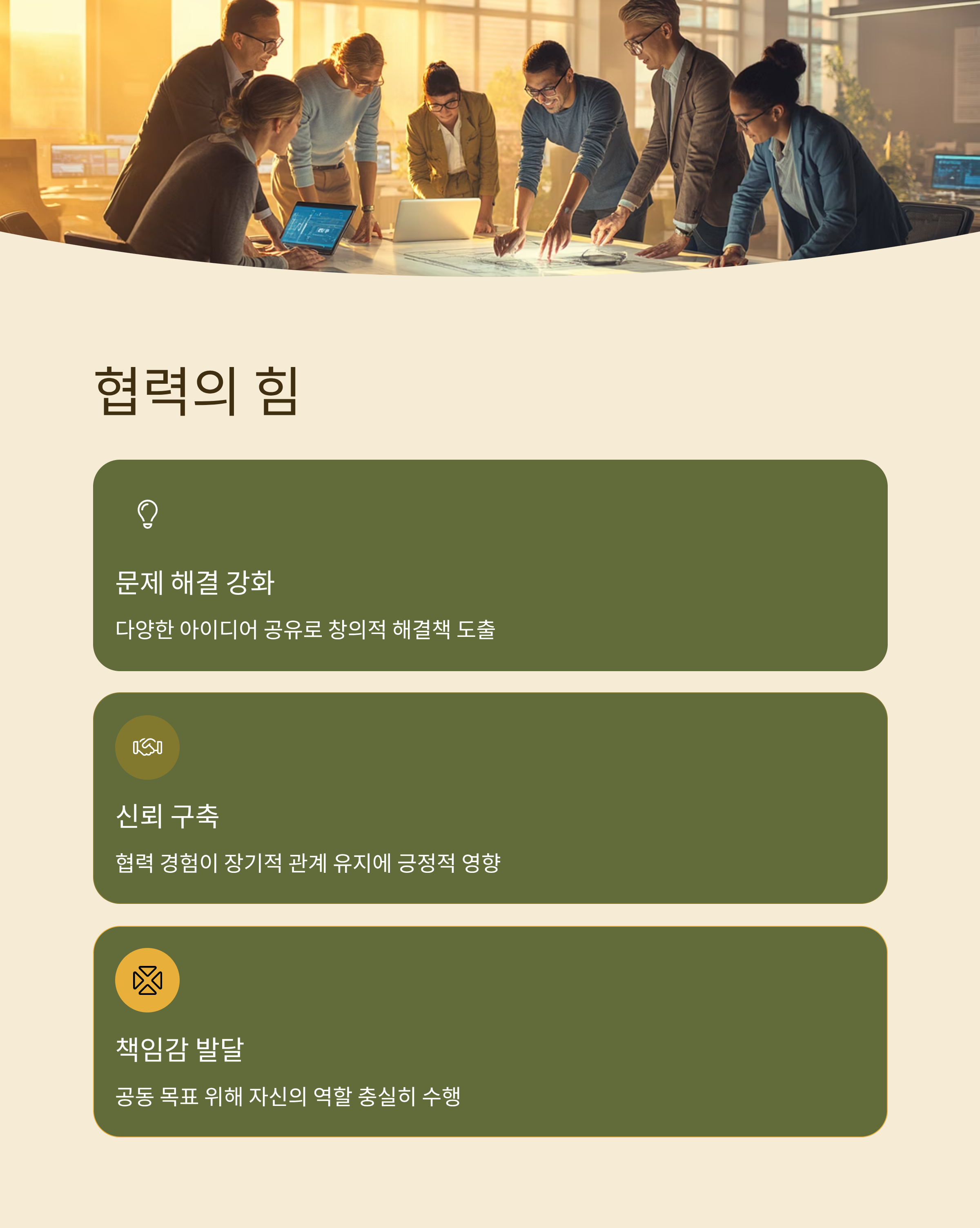 - 신뢰 구축: 협력은 서로에 대한 신뢰를 쌓는 기회가 되며, 장기적인 관계 유지에 긍정적 영향을 줍니다.