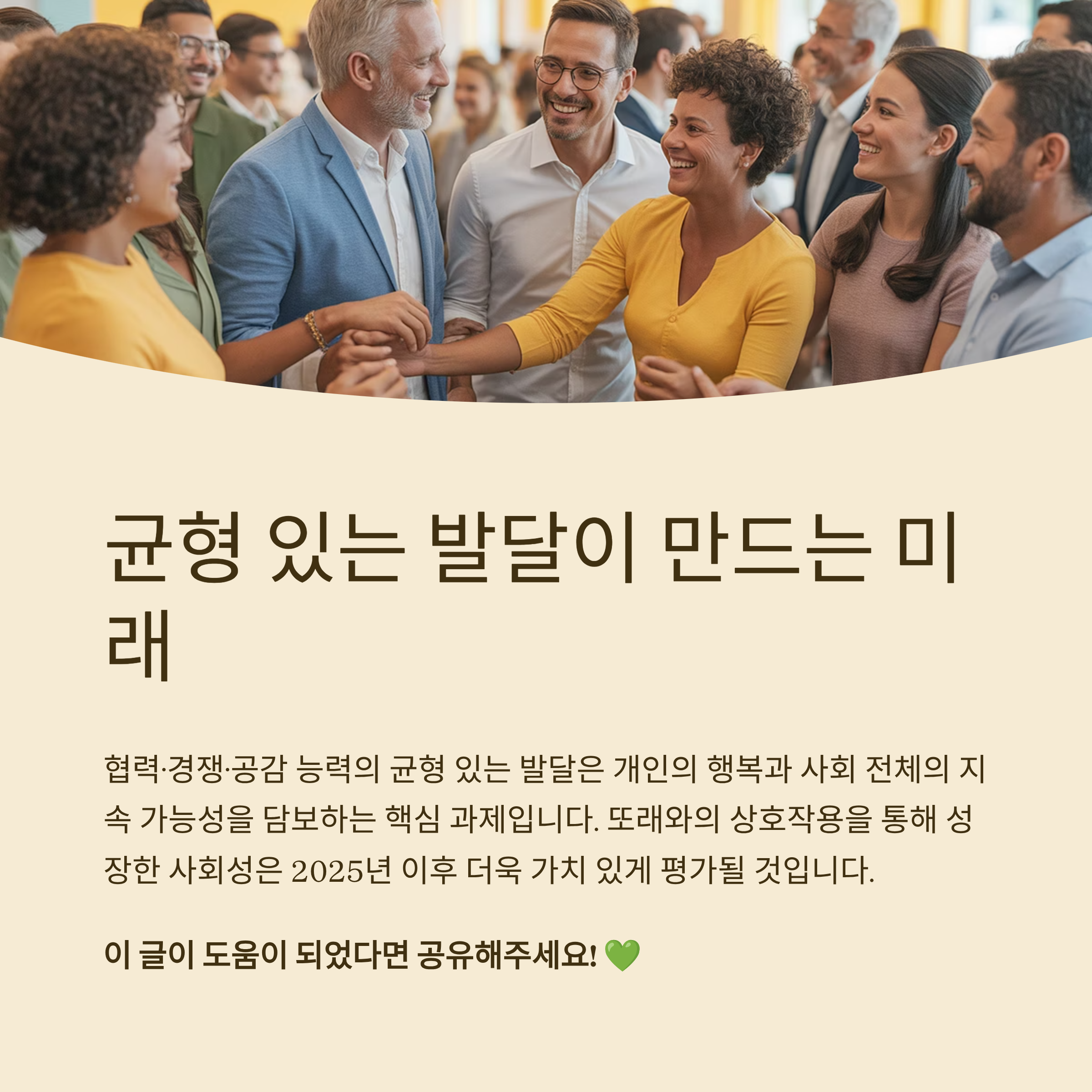따라서 또래와의 상호작용을 통해 협력·경쟁·공감 능력을 균형 있게 발달시키는 것은 개인의 행복뿐 아니라 사회 전체의 지속 가능성을 담보하는 중요한 과제입니다.
