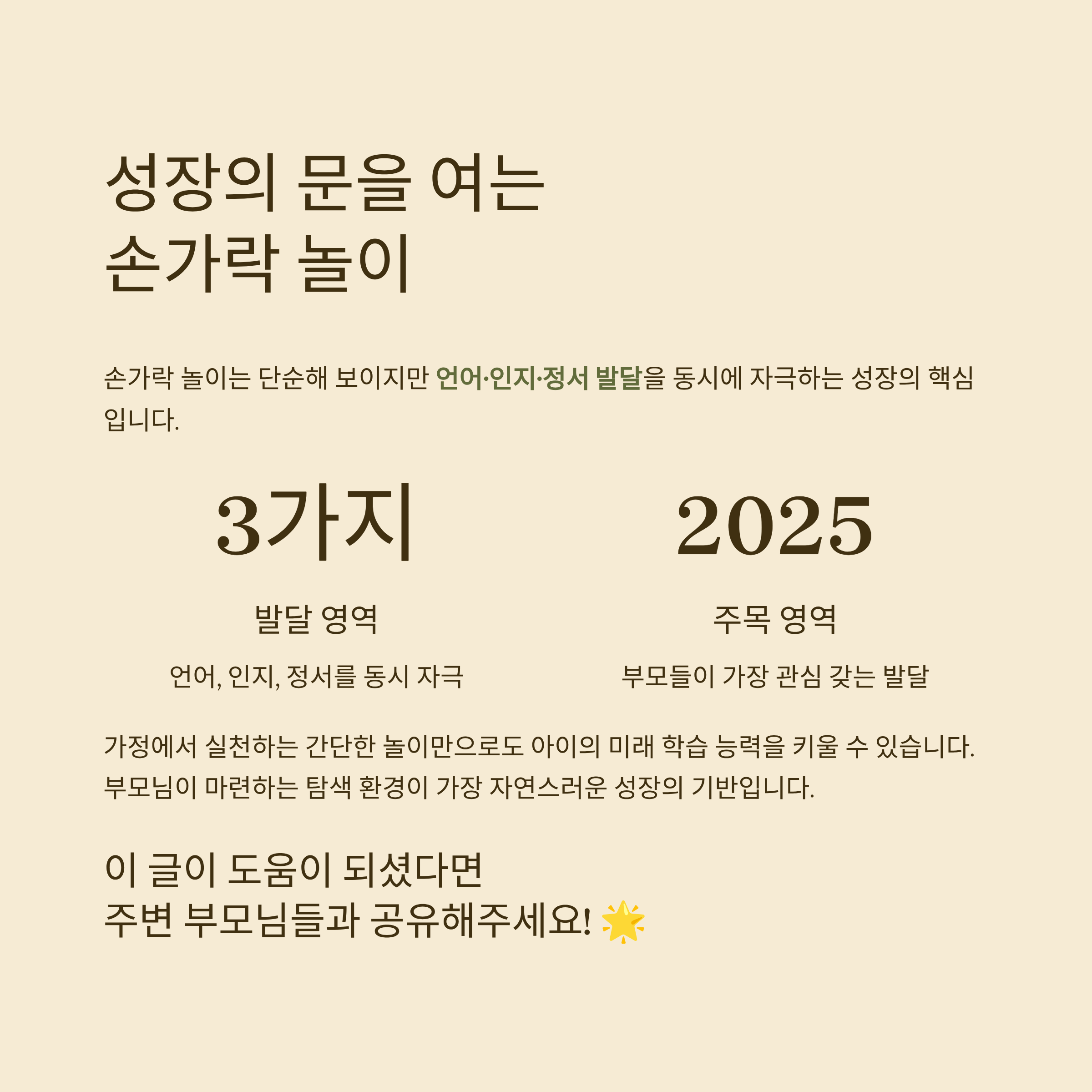 손가락 놀이는 단순한 유아 놀이처럼 보이지만, 그 안에는 아이의 언어 발달, 인지 발달, 정서 안정을 동시에 자극하는 중요한 성장 요소가 담겨 있습니다.