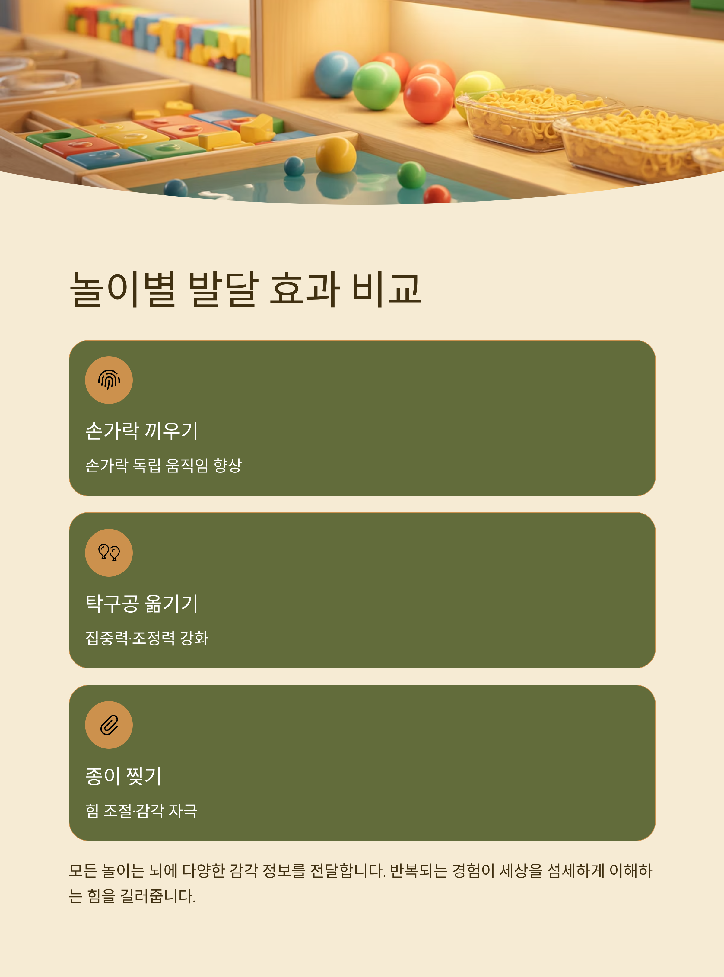 따라서 가정에서 실천할 수 있는 간단한 손가락 놀이—휴지 뽑기, 단추 끼우기, 책장 넘기기, 구슬 옮기기—만으로도 아이의 집중력과 문제 해결 능력을 키울 수 있습니다.