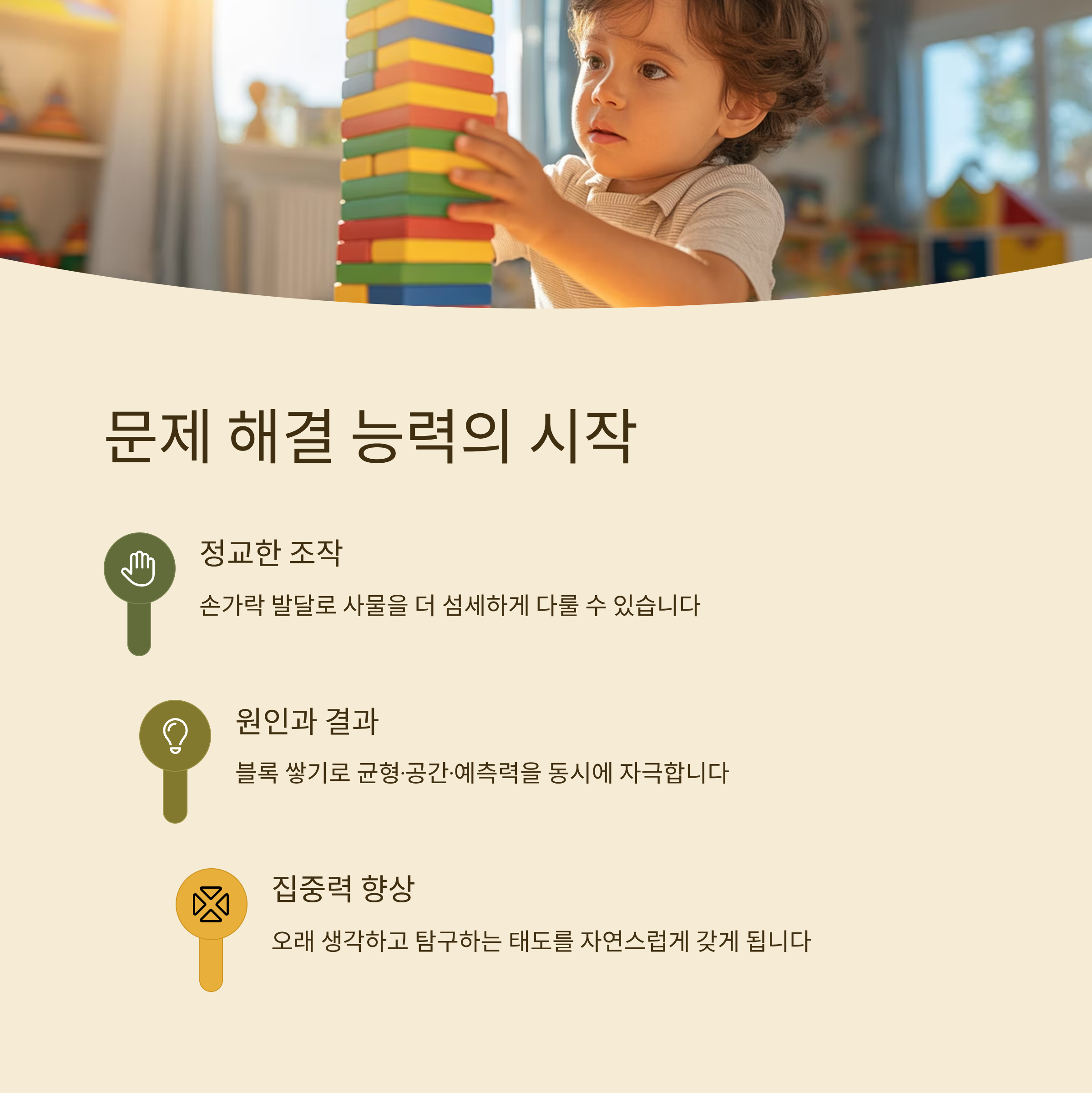 손가락 움직임이 발달하면 아이는 사물을 더 정교하게 조작할 수 있고, 그 과정에서 원인과 결과를 탐색합니다. 예를 들어 블록을 높게 쌓는 시도는 균형 감각, 공간 이해력, 예측력을 동시에 자극합니다.