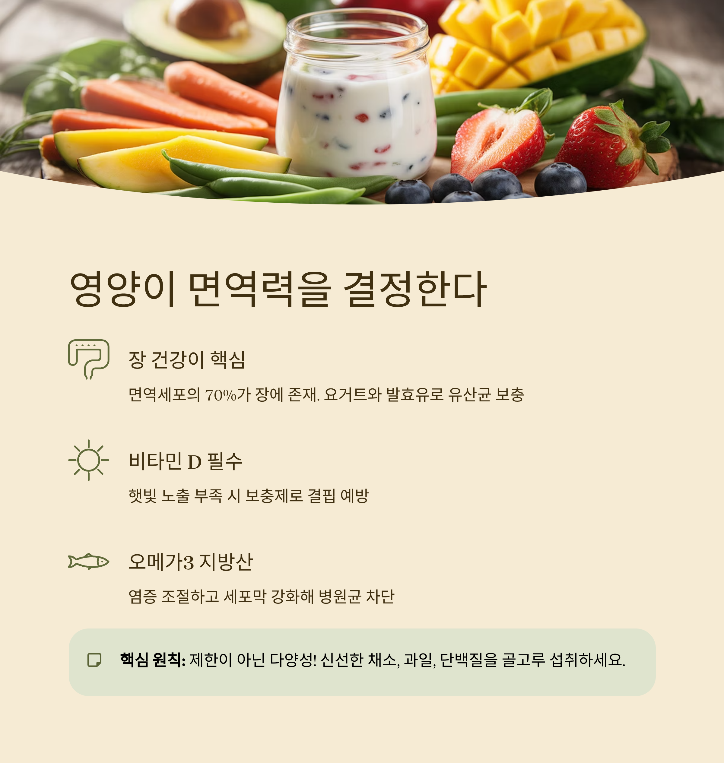 중요한 것은 ‘제한’이 아니라 ‘다양성’입니다. 특정 음식만 고집하거나 편식하는 습관은 면역력 저하로 이어집니다. 신선한 채소와 과일, 단백질 식품을 다양하게 섭취시키는 것이 핵심입니다.