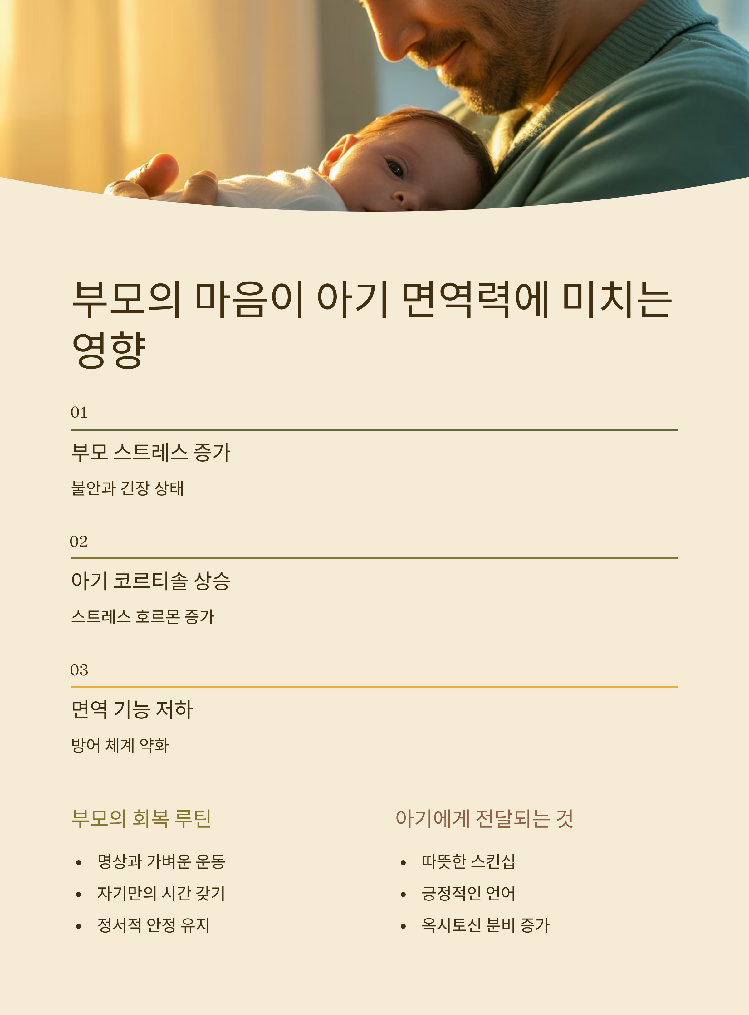 2025년의 연구 결과들은 한결같이 말합니다. 부모의 스트레스는 아기의 면역력에 직접적인 영향을 준다는 것입니다. 아기는 부모의 정서 상태를 그대로 흡수하며, 부모가 불안하거나 긴장하면 아기의 스트레스 호르몬(코르티솔) 수치가 높아지고 면역 기능이 저하됩니다.