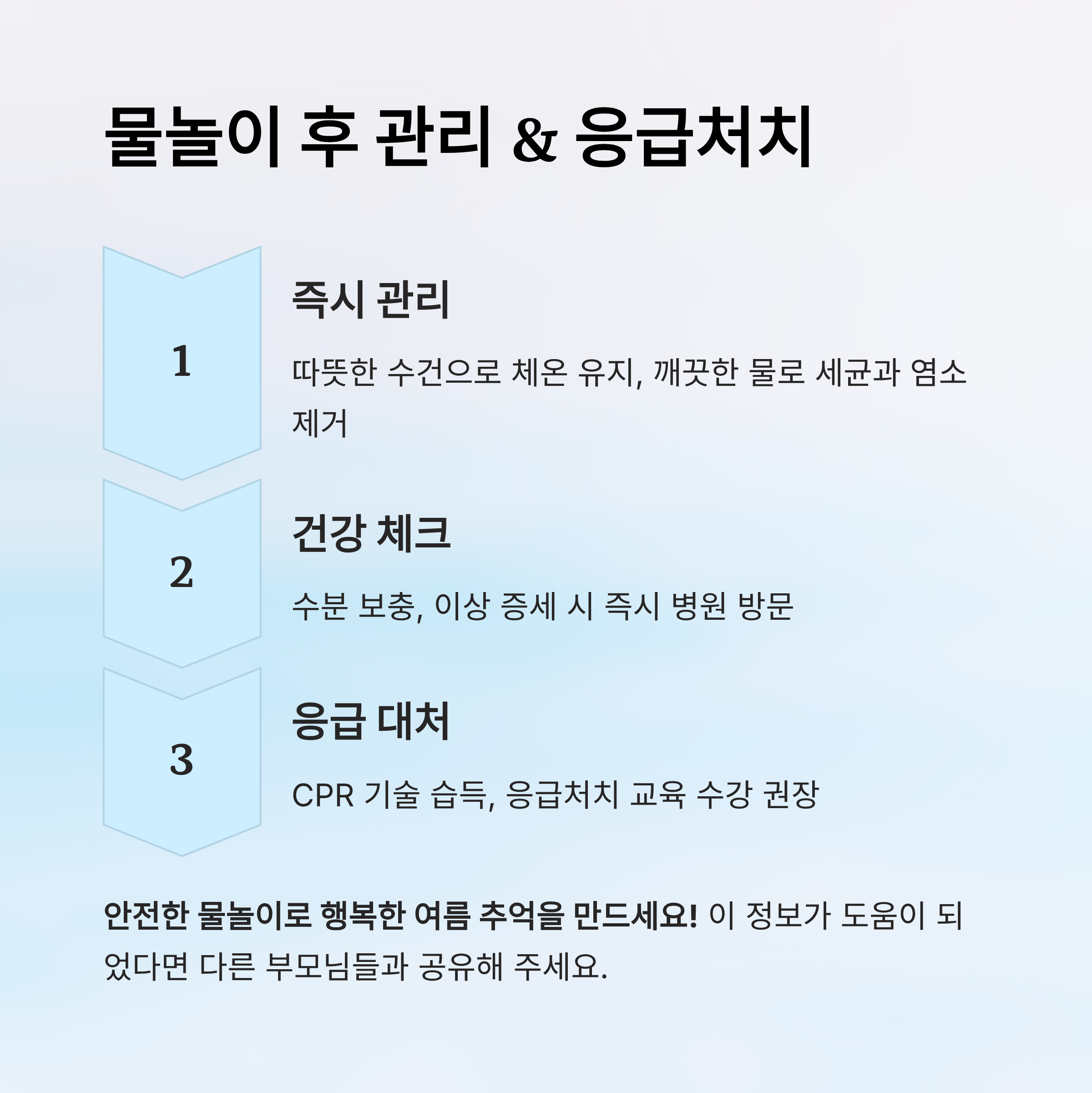 위 에서 알아 본 2025 아기 물놀이 안전하게 즐기는 법을 통해구명조끼 착용, 물놀이 후 관리, 응급 대처법까지 꼼꼼히 익혀둔다면 아기는 더 건강하고 안전하게 여름을 즐길 수 있습니다. 2025년 여름, 우리 아기와의 물놀이를 즐겁고 안전하게 만들어 보세요.