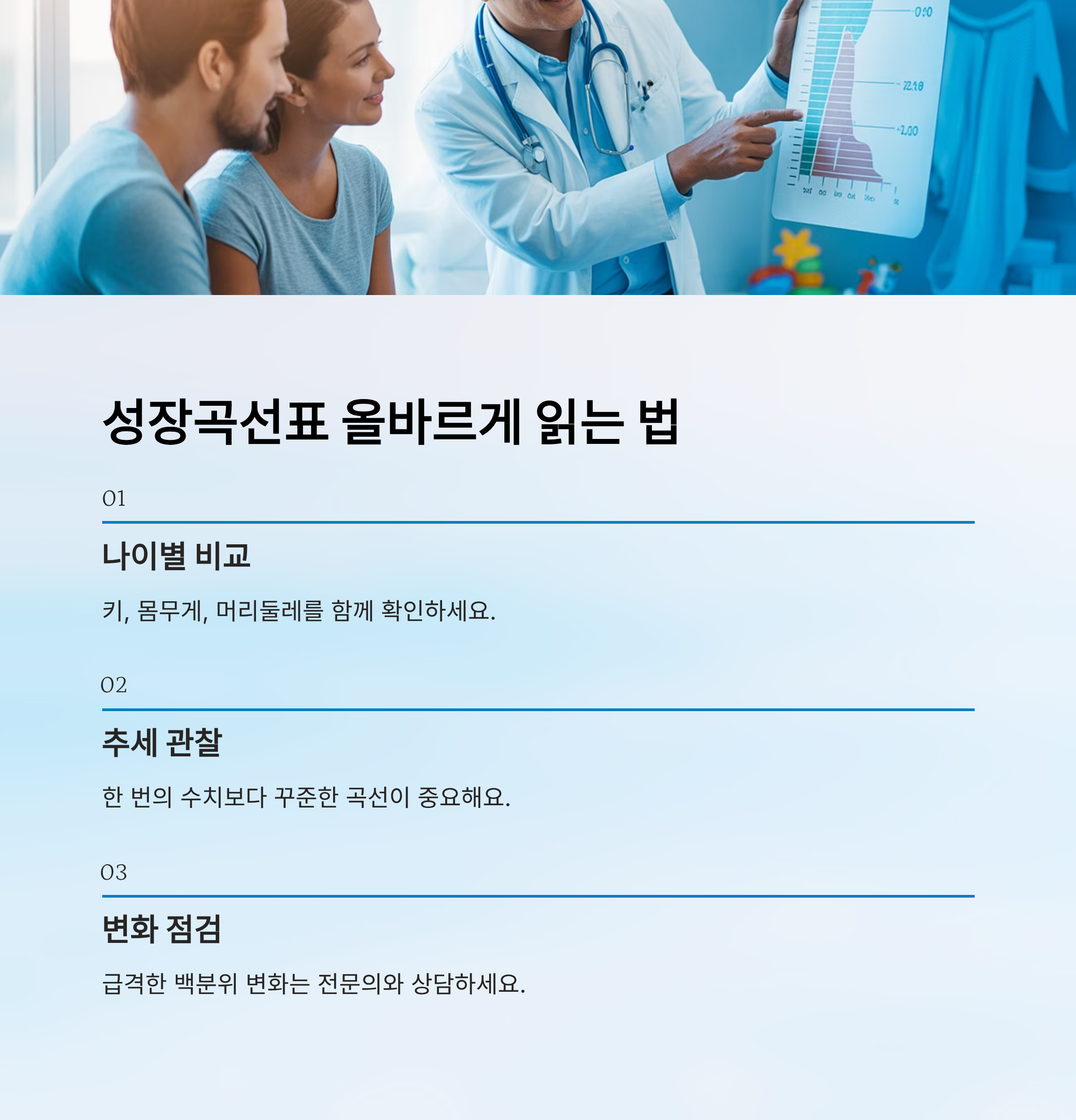 성장곡선표는 단순한 통계 자료가 아니라 아이의 건강을 이해하는 지도입니다. 이 지도를 올바르게 읽을 수 있다면, 불필요한 걱정을 줄이고 정확한 방향으로 아이를 도와줄 수 있습니다. 매달 키와 몸무게를 측정해 기록하는 일은 작아 보이지만, 시간이 지나면 큰 의미가 됩니다. 그 안에는 부모의 관심, 사랑, 그리고 아이의 성장 이야기가 함께 담겨 있기 때문입니다.