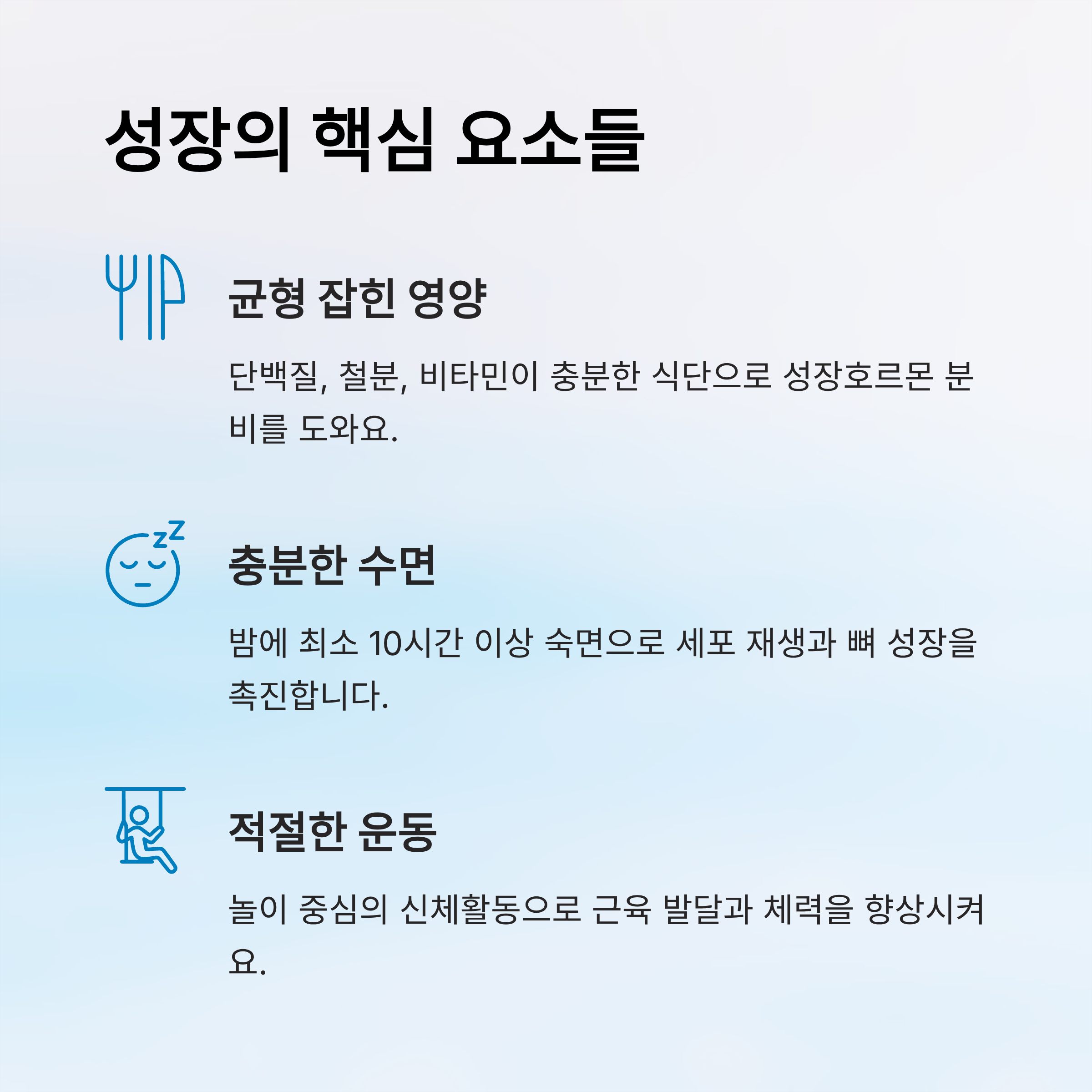 아이의 성장을 결정짓는 가장 큰 요소는 영양과 수면입니다. 균형 잡힌 식단은 성장호르몬 분비를 돕고, 충분한 숙면은 세포 재생과 뼈 성장을 촉진합니다.