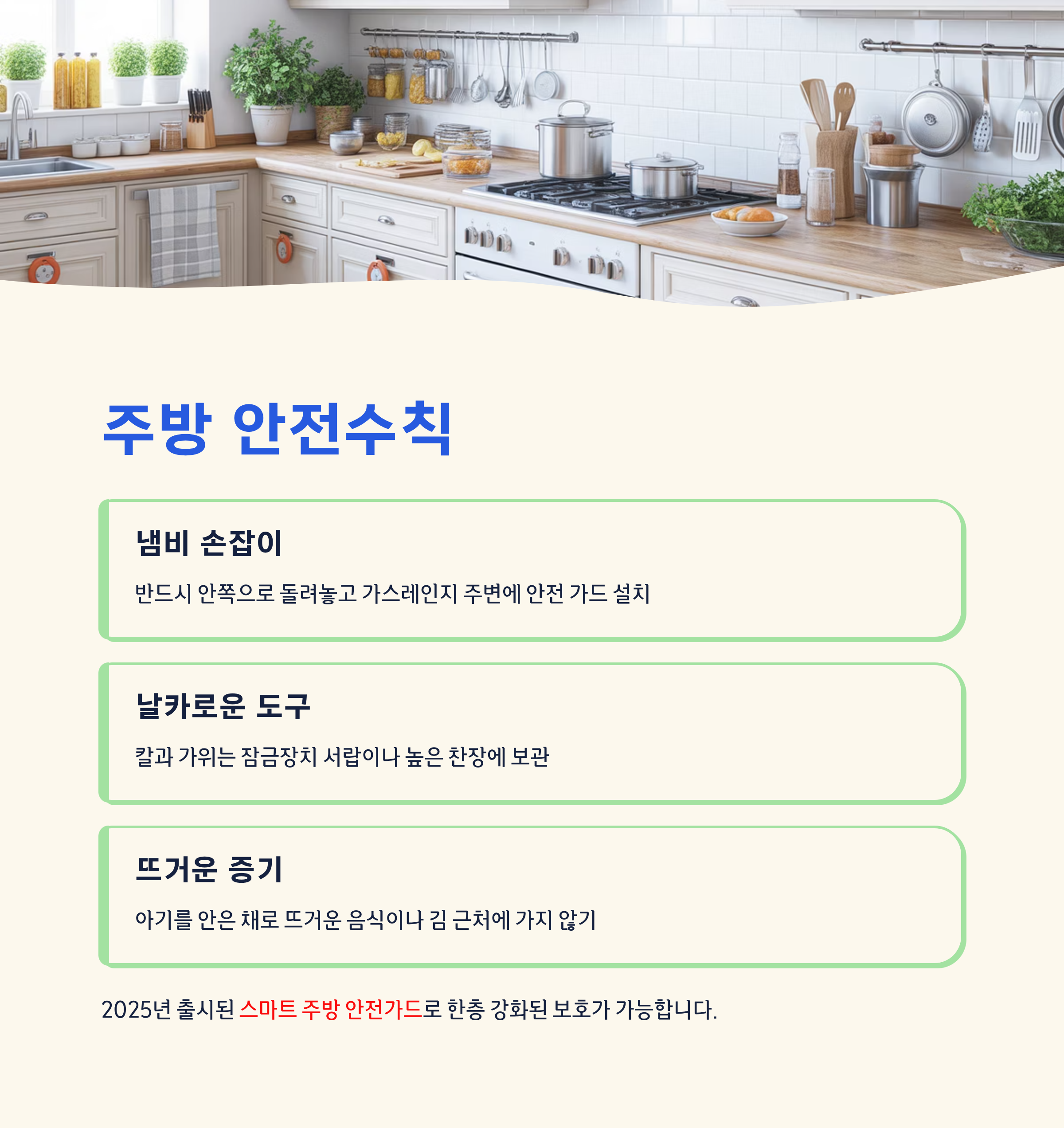 2025년에는 ‘아동안전 잠금장치’, ‘열차단 매트’, ‘스마트 주방 안전가드’ 같은 다양한 제품들이 출시되어, 주방 안전을 한층 강화할 수 있습니다.