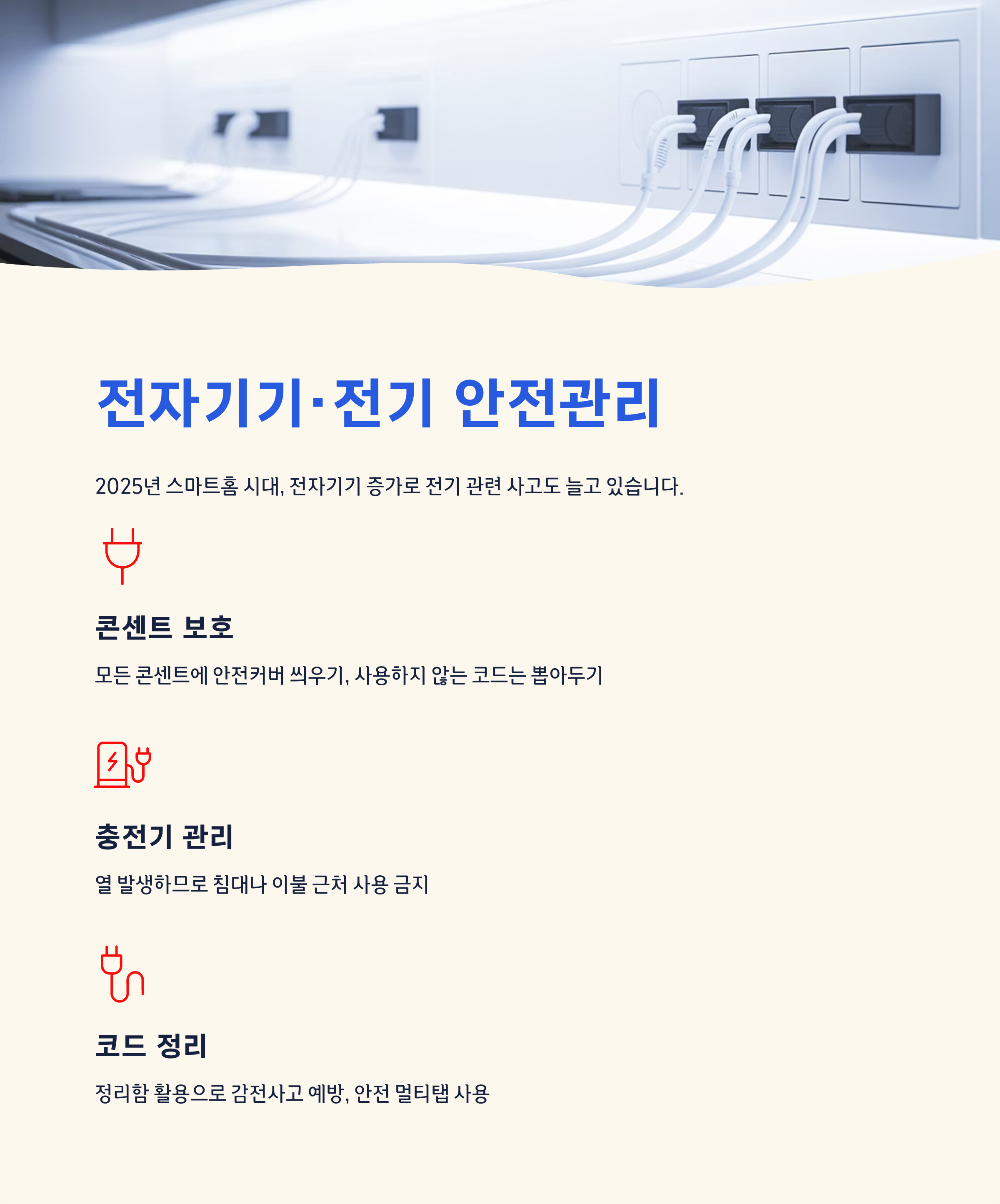 코드 정리함을 활용하면 감전사고를 예방할 수 있으며, ‘감전방지 플러그’, ‘아기용 안전 멀티탭’, ‘전자파 차단 커버’ 같은 제품도 적극적으로 활용해보세요.