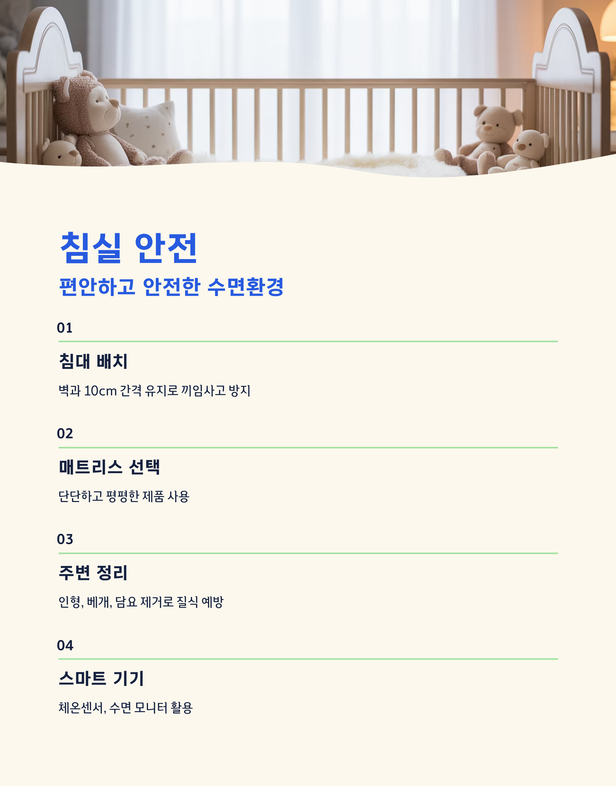 커튼 끈, 전선, 장식품 등은 모두 아기 손이 닿지 않게 치워두세요. 또한 통기성이 좋은 잠옷과 침구를 사용하고, ‘스마트 체온센서’나 ‘아기 수면 모니터’ 같은 2025년형 스마트 기기를 활용하면 안전을 더욱 강화할 수 있습니다.