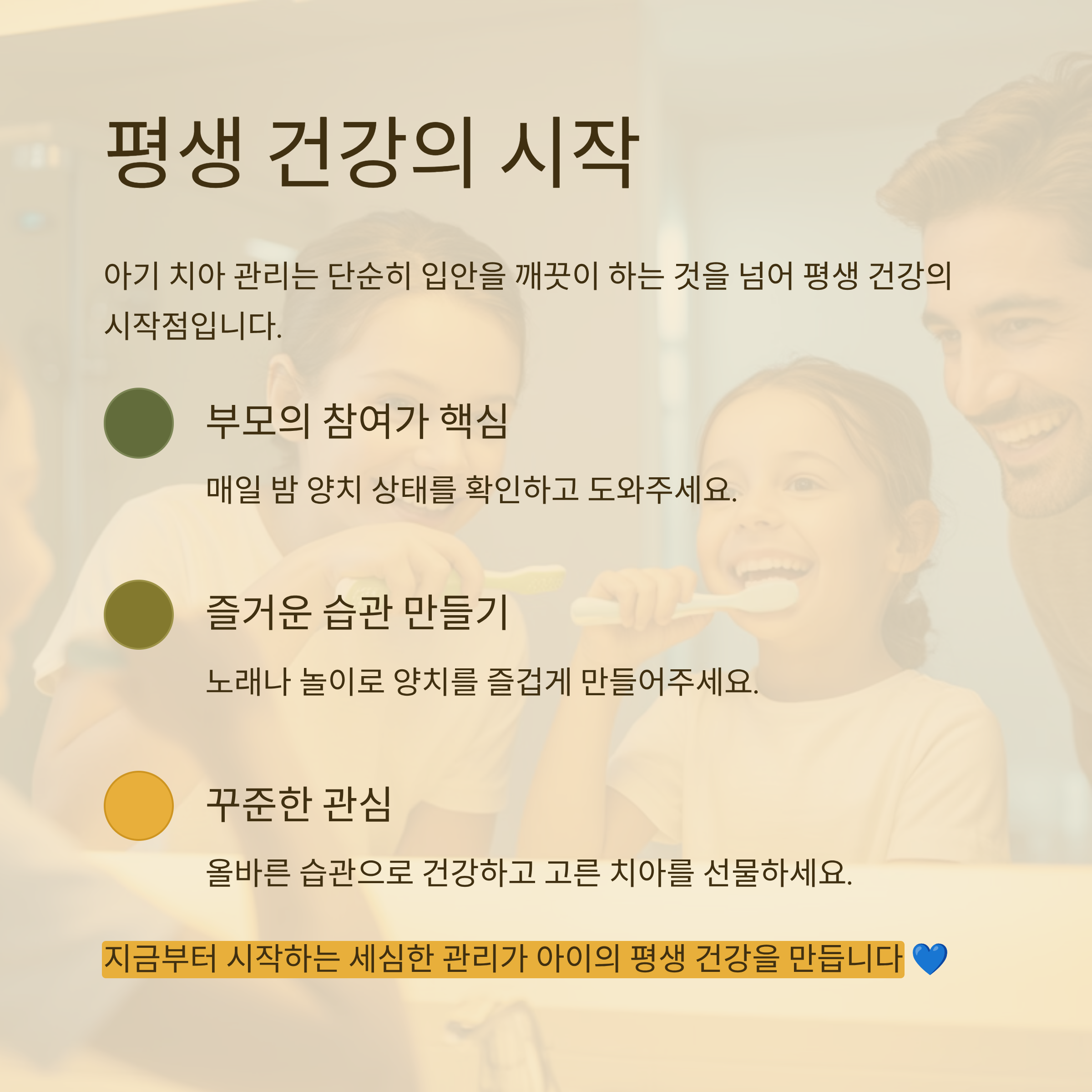아기 치아 관리의 핵심은 부모의 참여입니다. 아기가 혼자 양치할 수 있다고 해도 완전히 맡겨서는 안 됩니다. 부모는 매일 밤 양치 상태를 확인하고, 아기가 닦지 못한 부분을 도와줘야 합니다.