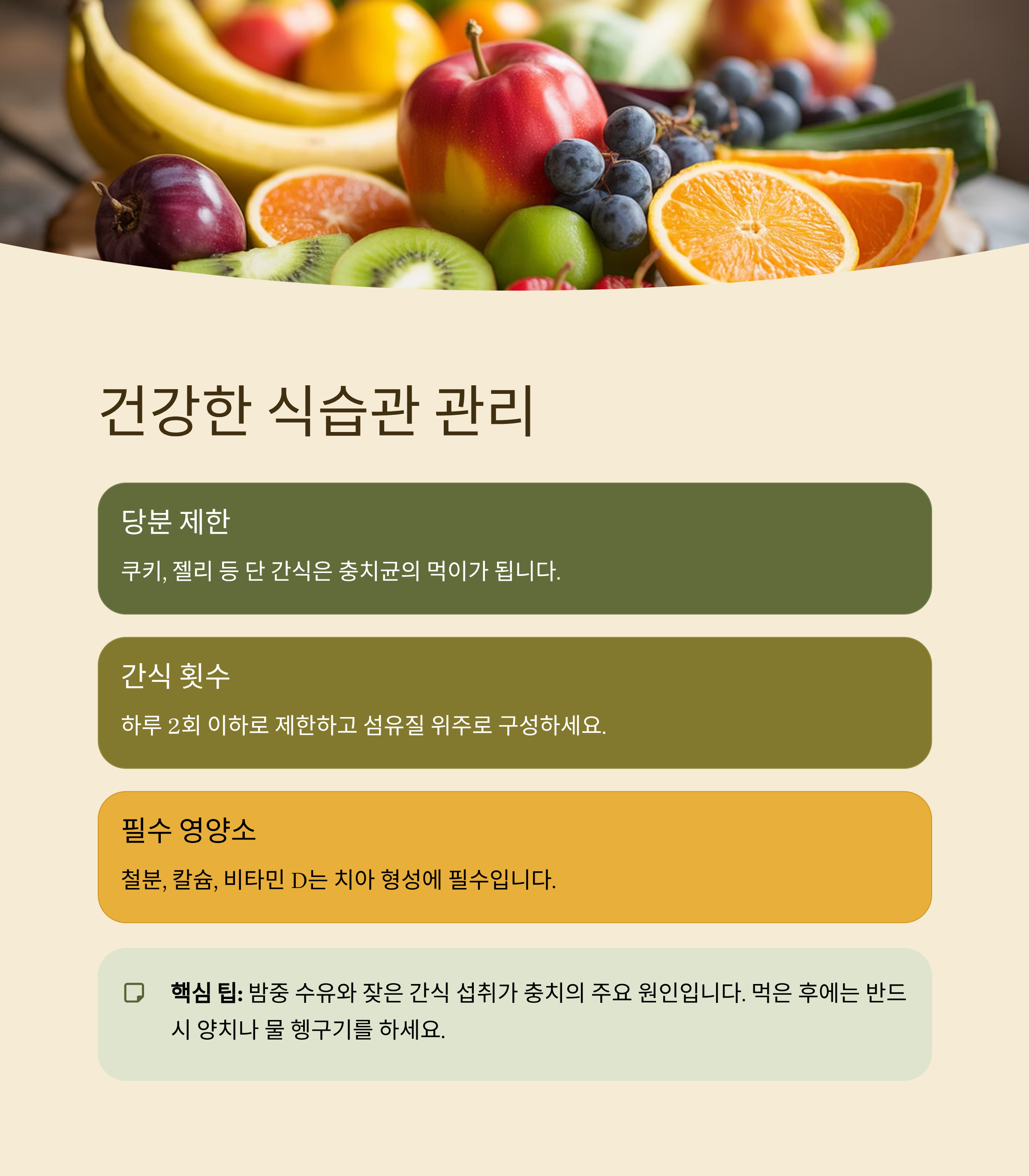 특히 4세 이후에는 간식 섭취가 늘어나므로 단 음식 후에는 반드시 양치하거나 물로 헹구는 습관을 들이세요.