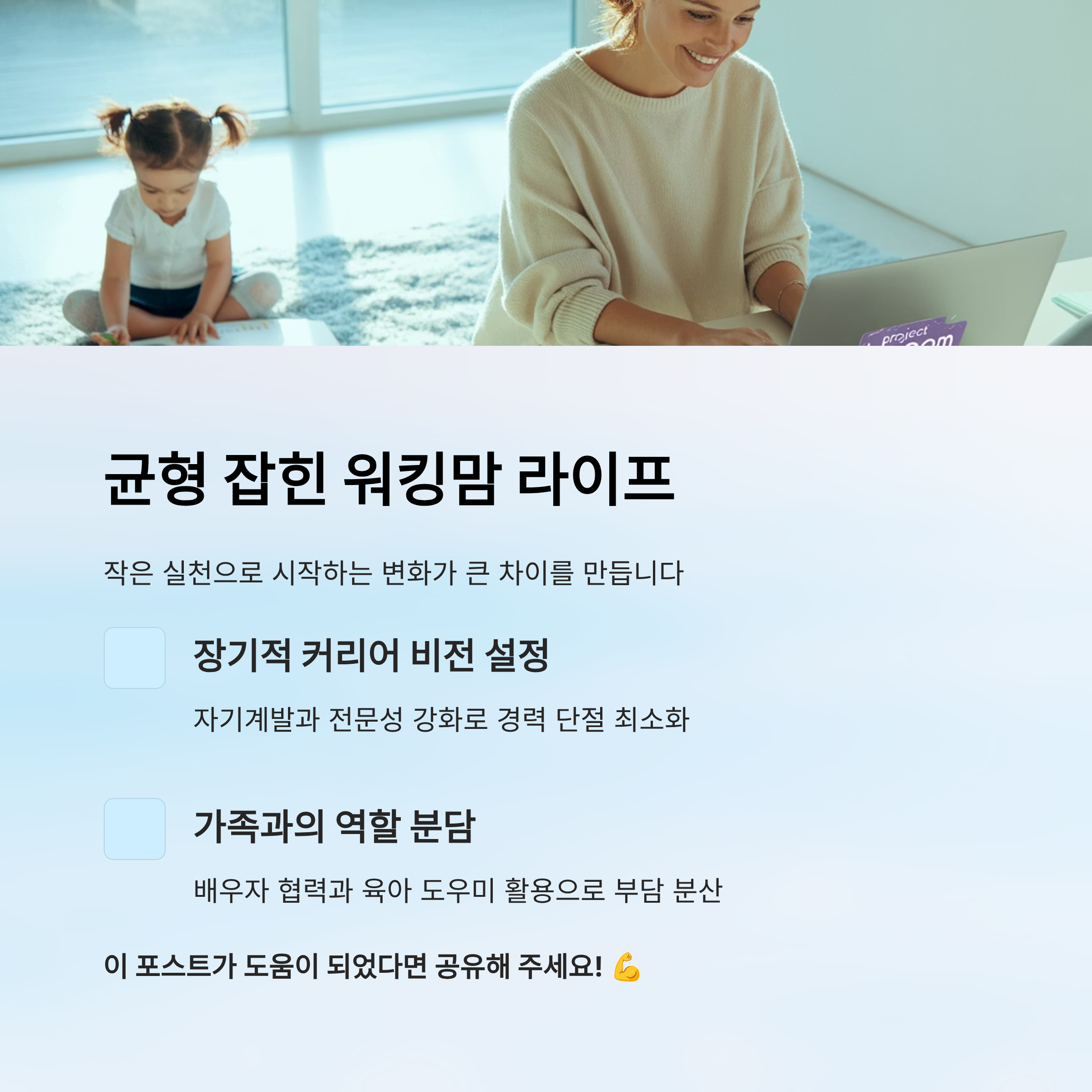 배우자와 협력하고, 필요하다면 부모나 육아 도우미의 도움을 받는 것도 장기적인 균형에 도움이 됩니다. 워킹맘이 커리어와 육아 모두에서 만족을 얻기 위해서는 단기적인 희생보다 장기적인 비전을 두는 전략이 필수적입니다.