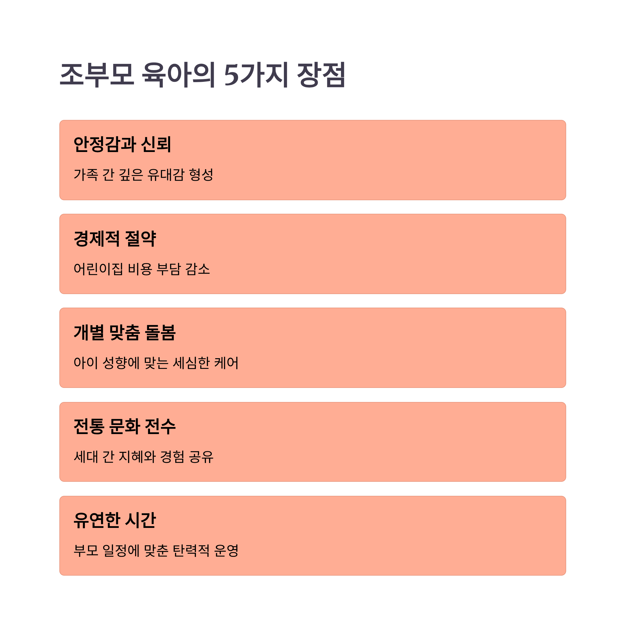 또한 조부모의 풍부한 육아 경험은 아동의 안전과 건강 관리에 실질적인 도움을 줍니다.