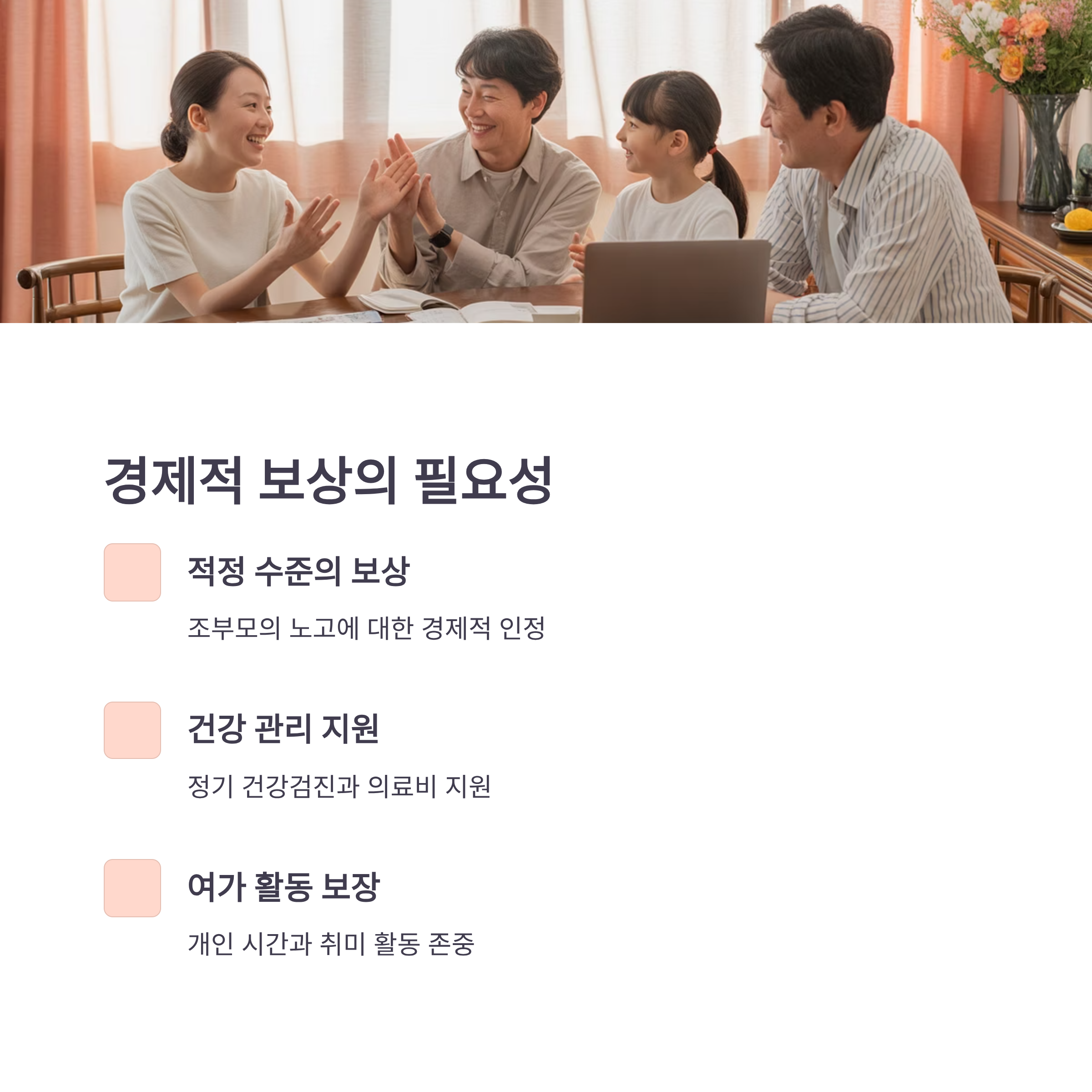 - 정부 및 지자체 제도 적극 활용: 조부모 돌봄 포인트, 가족 돌봄 휴가 제도 등을 통해 경제적 부담을 완화합니다.