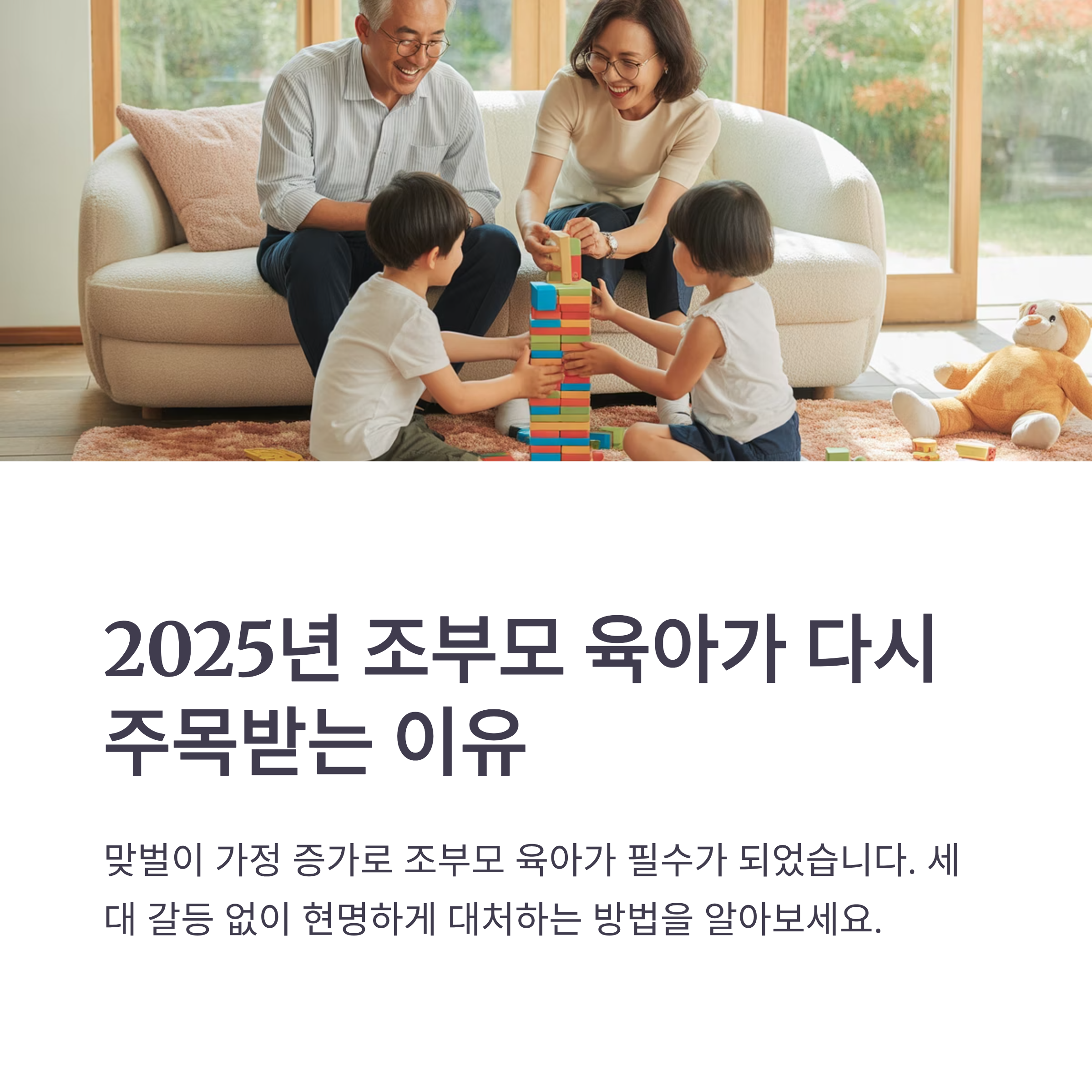 2025년 현재, 맞벌이 가정이 증가하면서 조부모 육아가 다시 주목받고 있습니다. 이번 글에서는 조부모 육아의 장단점을 객관적으로 분석하고, 세대 간 갈등 없이 현명하게 대처할 수 있는 현실적인 방법을 자세히 알아보겠습니다.